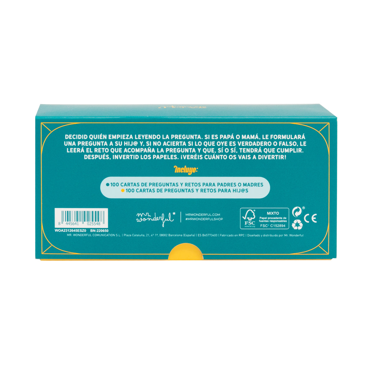 Juego de cartas pensado para que padres y/o madres jueguen con los peques. A partir de 10 años. El juego cuenta con 200 cartas: 100 preguntas para que los hijos las formulen a los padres y otras 100 para que los padres las formulen a los hijos (se trata en cada caso de una afirmación que hay que adivinar si es verdadera o falsa). En caso de fallar, en cada tarjeta encontramos una prueba que se deberá llevar a cabo.