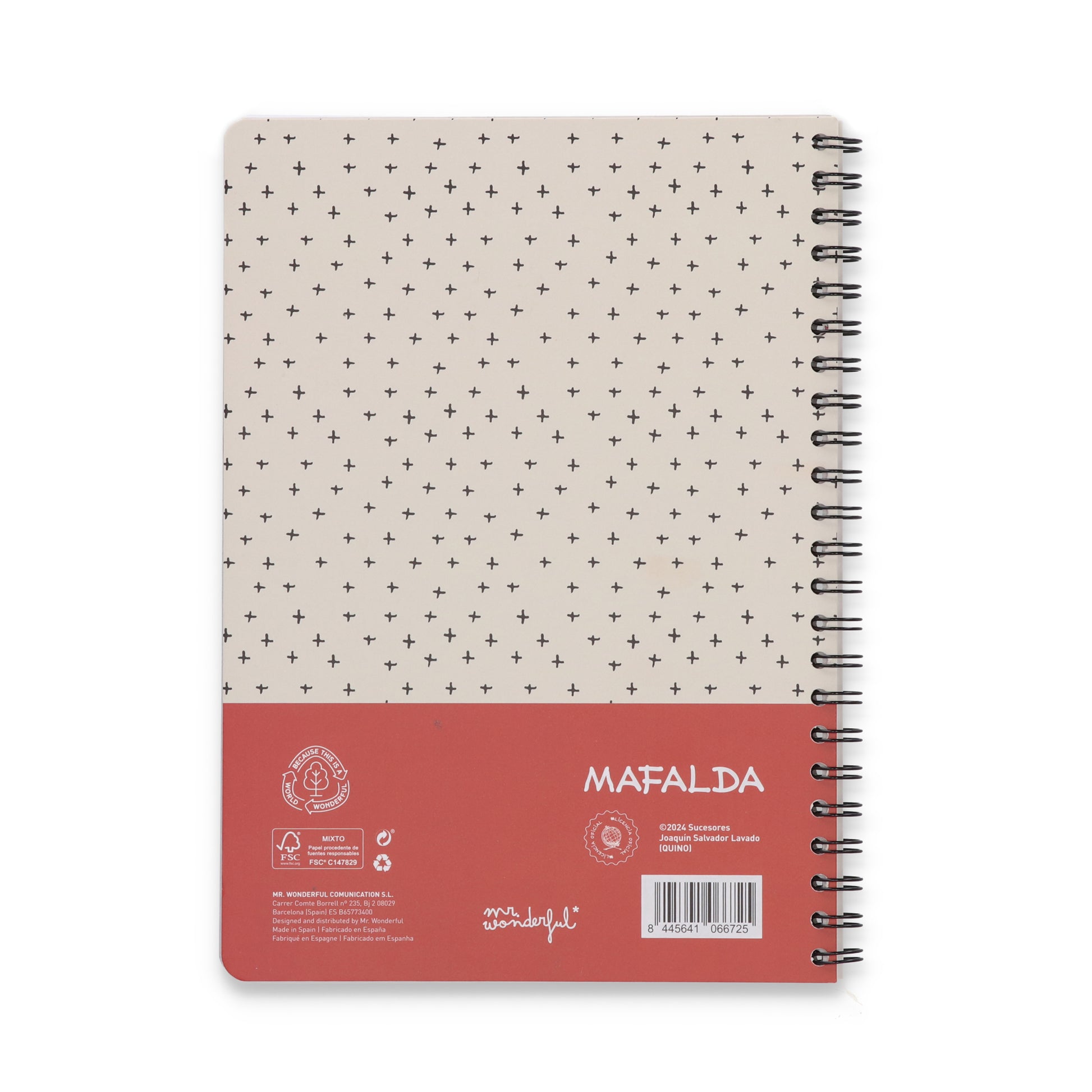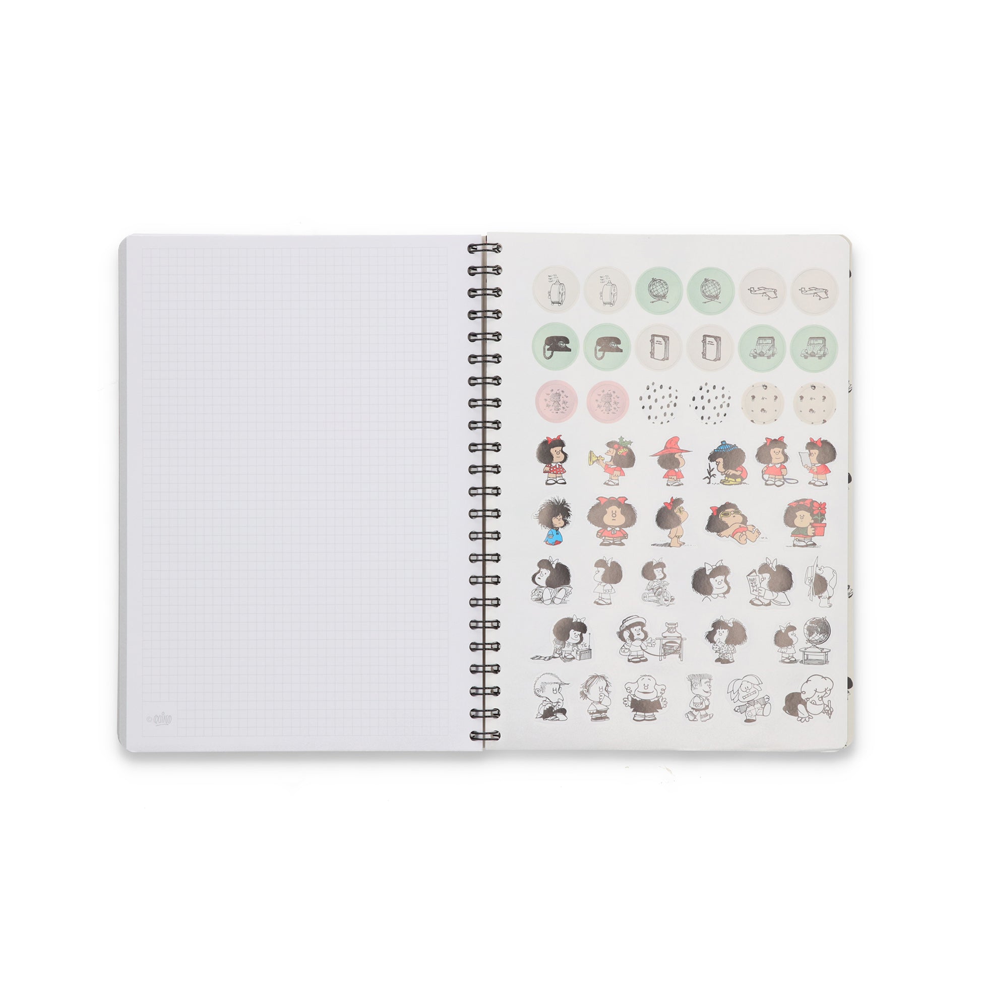 Cahier format A4 avec reliure spirale. Sur la couverture, Mafalda et Felipe sont les protagonistes, avec un design et un message de Quino. Intérieur réglé. Comprend 1 feuille d'autocollants, également de Mafalda.
