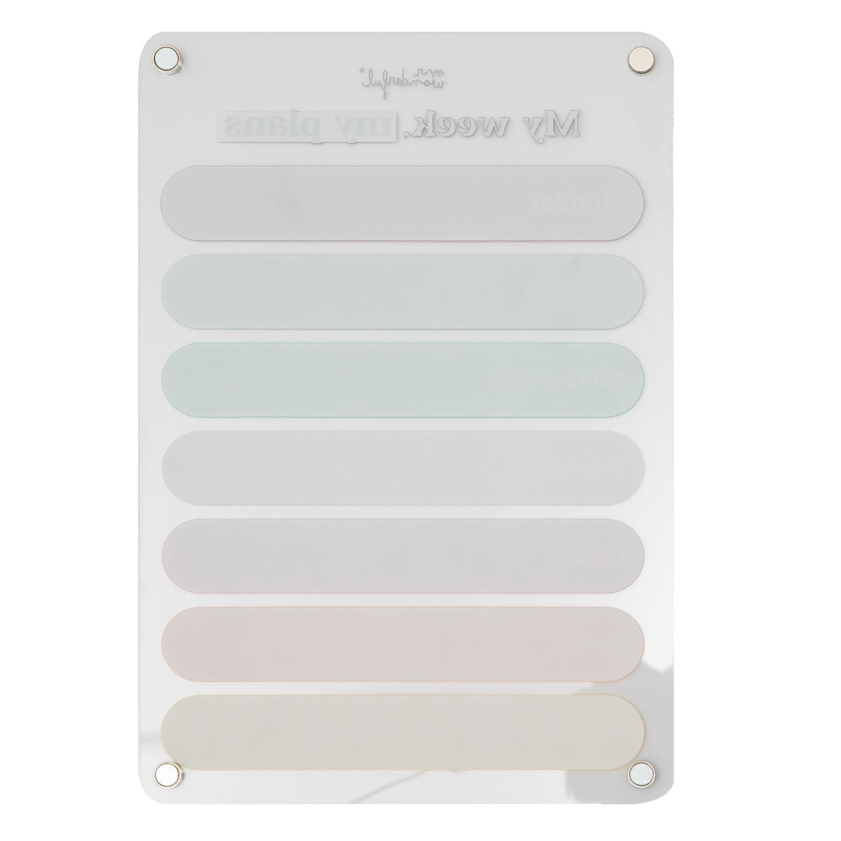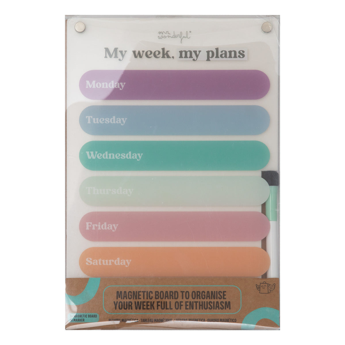 Organiseur hebdomadaire transparent avec dos magnétique, idéal pour accrocher au réfrigérateur. Il présente les jours de la semaine et comprend un marqueur effaçable à encre noire, qui peut être facilement effacé avec l'éponge incluse ou avec un chiffon sec.
