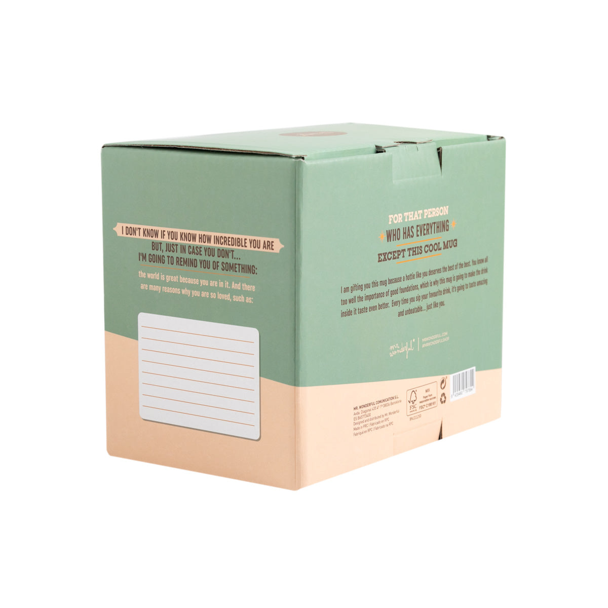 Chez Mr. Wonderful, nous savons que la meilleure façon de commencer la journée est d'avoir entre les mains quelque chose de délicieux que vous aimez. Qu'il est délicieux ce café du petit-déjeuner qui vous aide à vous réveiller et à démarrer ! Et que dire de celui que vous buvez en milieu de matinée et qui maintient votre inspiration à un niveau élevé ? Nous sommes sûrs que vous apprécierez également une tasse de café rapide après le travail pour garder votre énergie au top. Chacune a son charme et crée un moment unique. Il est vrai que le plus important se trouve à l'intérieur, mais nous sommes convaincus que la bonne tasse rend tout bien meilleur et nous sommes experts dans la conception exacte de ce dont vous avez besoin. Imaginez à quel point vous allez rendre cette personne spéciale à qui vous offrez cette tasse, Tom, excitée et à quel point elle se souviendra de vous à chaque fois qu'elle prendra son café. C'est une façon super originale de leur dire qu'on les aime. Vous verrez comment, dès qu'ils le verront, un sourire se répandra sur leur visage dont ils ne pourront pas se débarrasser de toute la journée et ils sentiront qu'ils sont extrêmement chanceux d'avoir quelqu'un d'aussi merveilleux que vous dans leur vie.