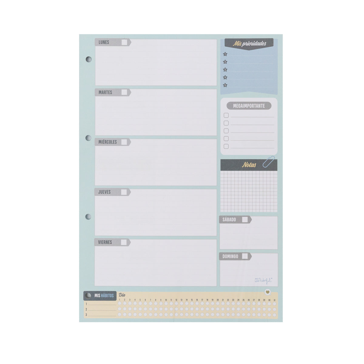 Agenda hebdomadaire au format vertical, avec feuilles détachables. Il comporte 60 feuilles dans lesquelles alternent 4 motifs différents. L'organiseur est réalisé en papier offset 90g. et comprend 4 feuilles d'autocollants amusants.