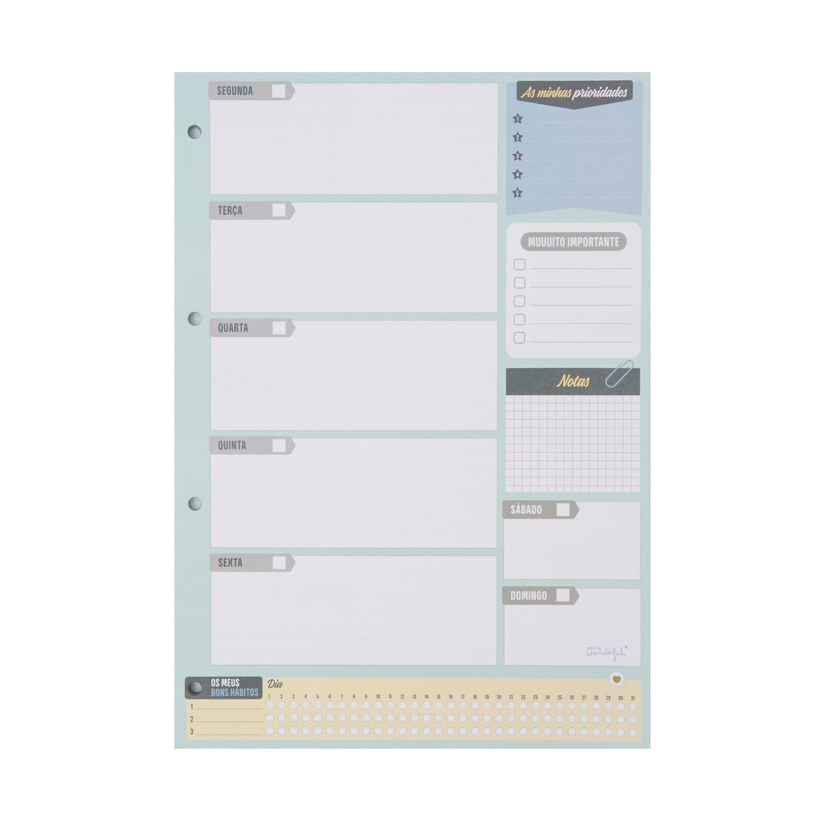 Organiseur d'organisation hebdomadaire avec chaîne en spirale. Son format est rectangulaire et possède un revêtement dur. Il contient 192 pages de papier 90 g, où s'alternent 8 mises en page différentes. Il comprend également 4 feuilles de colle autocollante.