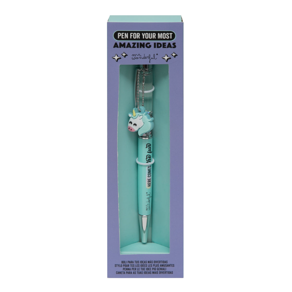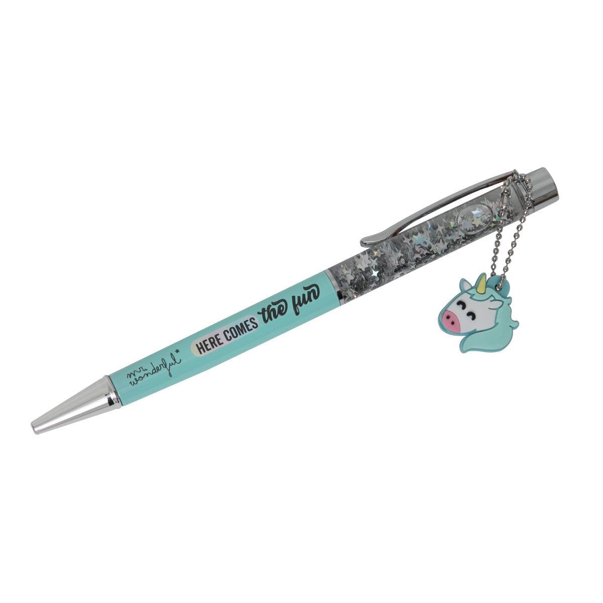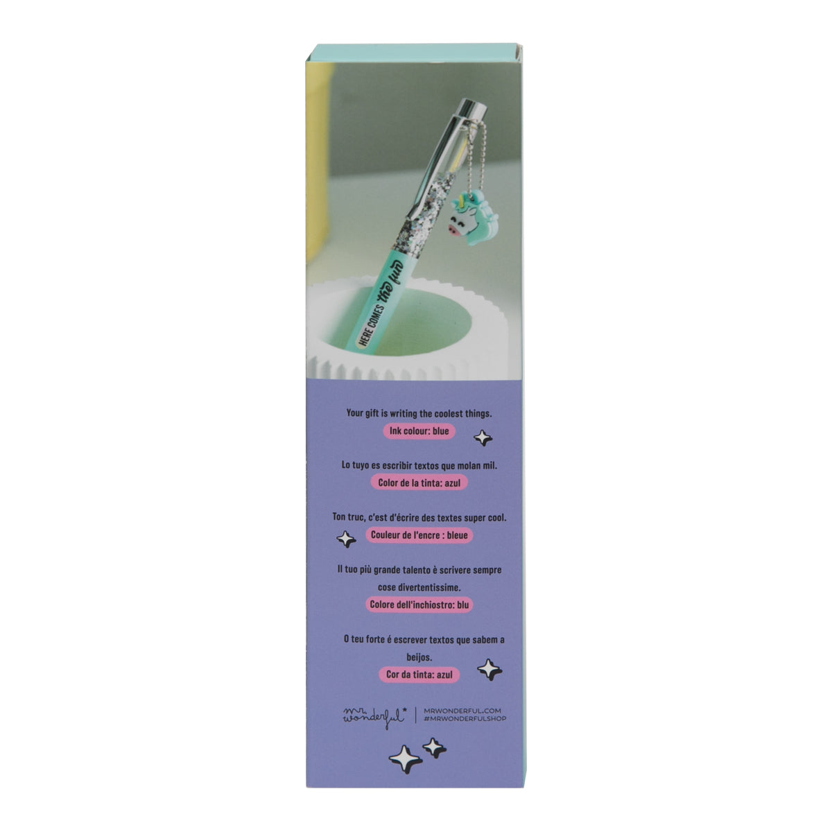 Stylo avec un dessus en plastique transparent, des paillettes à l'intérieur, un message en anglais en bas et un personnage de Mr. Wonderful suspendu à une petite chaîne au bout. Couleur de l'encre : bleu.