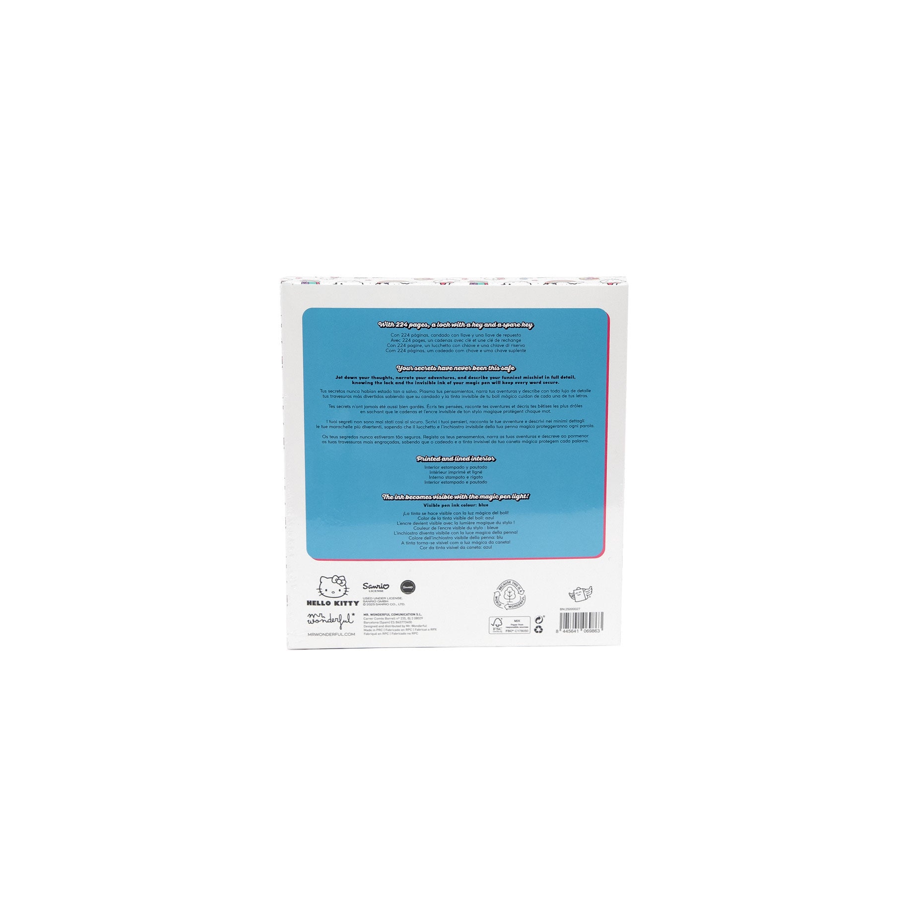 Diario personal con Hello Kitty como protagonista y 224 páginas pautadas y estampadas y cierre de candado con llave (se adjunta llave de repuesto). Además, incluye un bolígrafo con tinta normal de color azul, por un lado, y con tinta "mágica" por el otro: la tinta resulta invisible a la vista hasta que se ilumina con la luz que lleva incorporada el mismo bolígrafo.