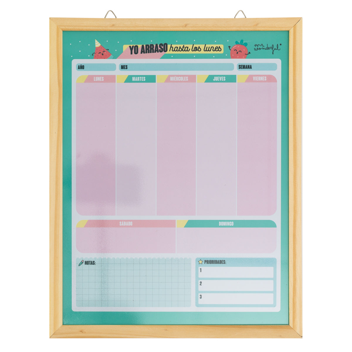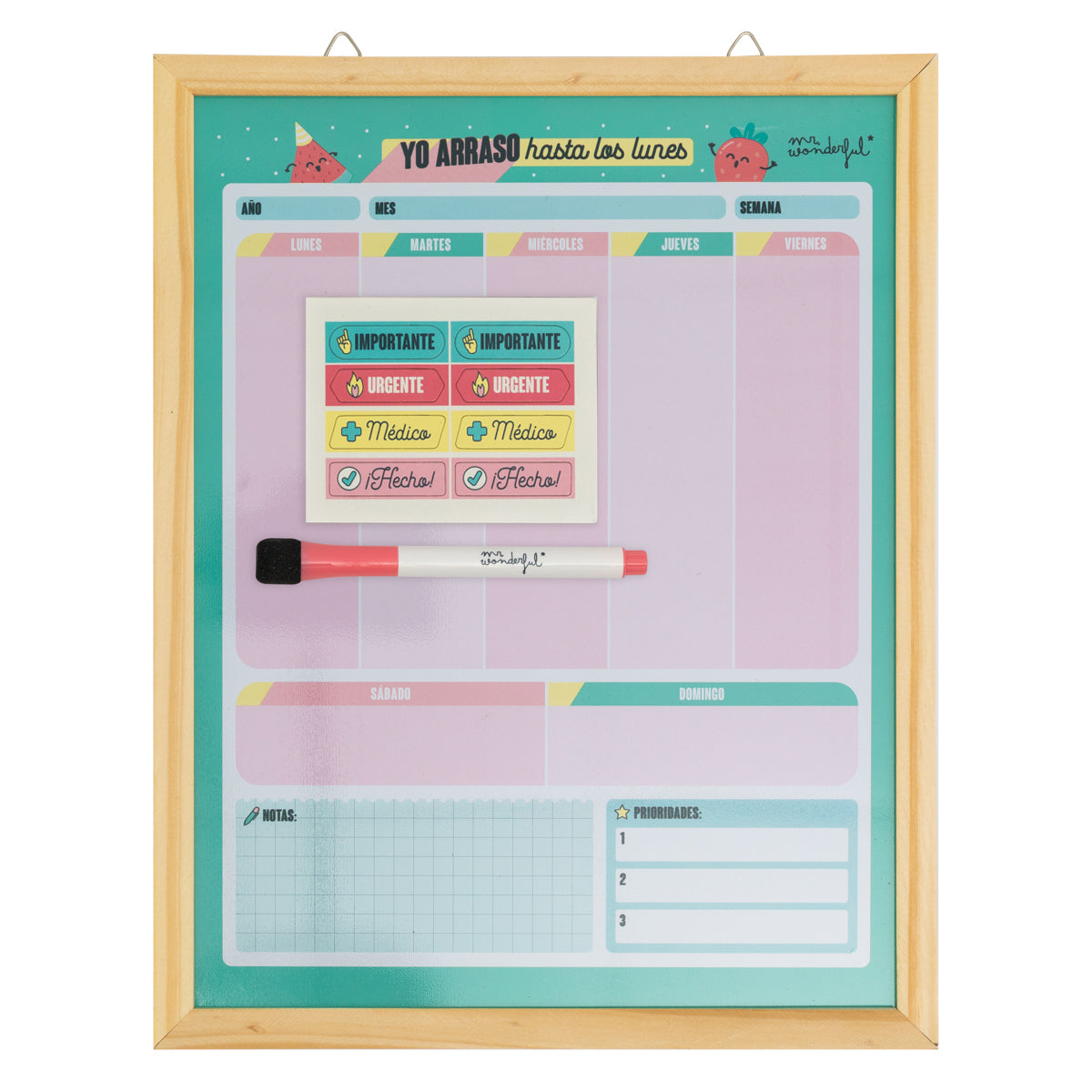 Agenda hebdomadaire magnétique, avec surface tableau blanc. Comprend un marqueur effaçable à encre noire, permettant une utilisation indéfinie. En plus d'être magnétique, ce qui permet de l'accrocher à la surface de la