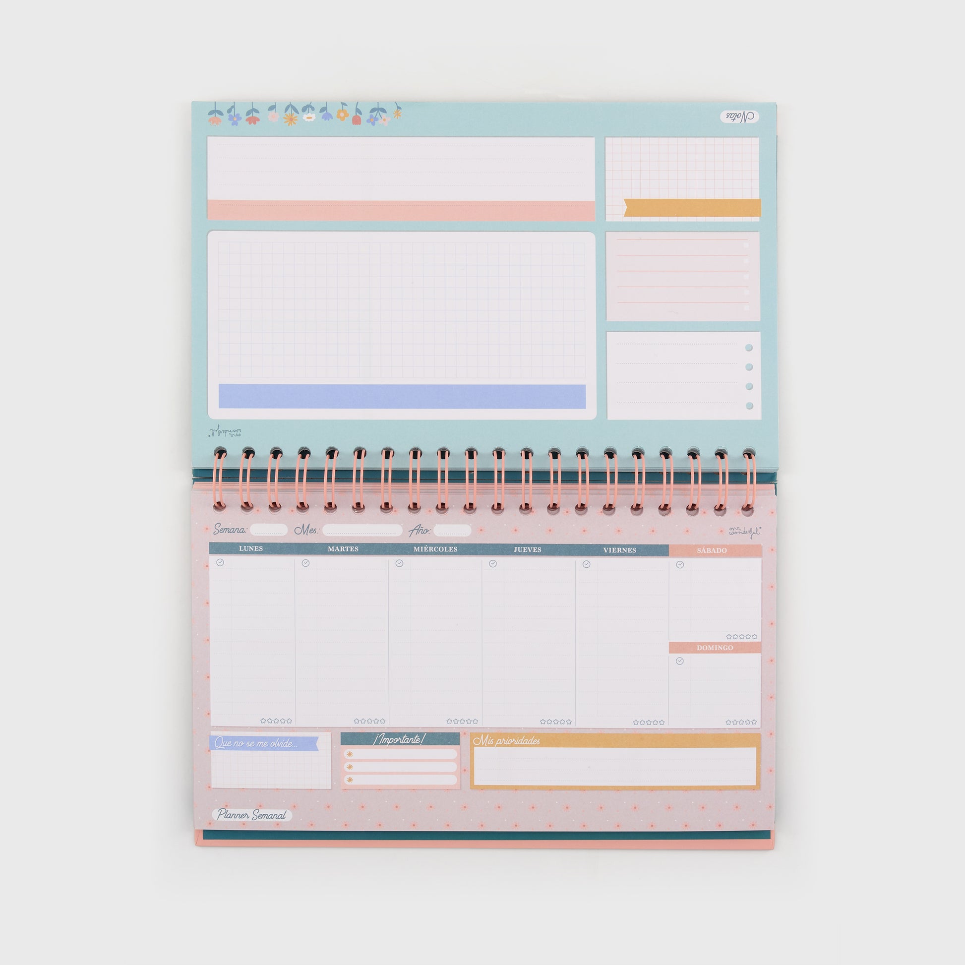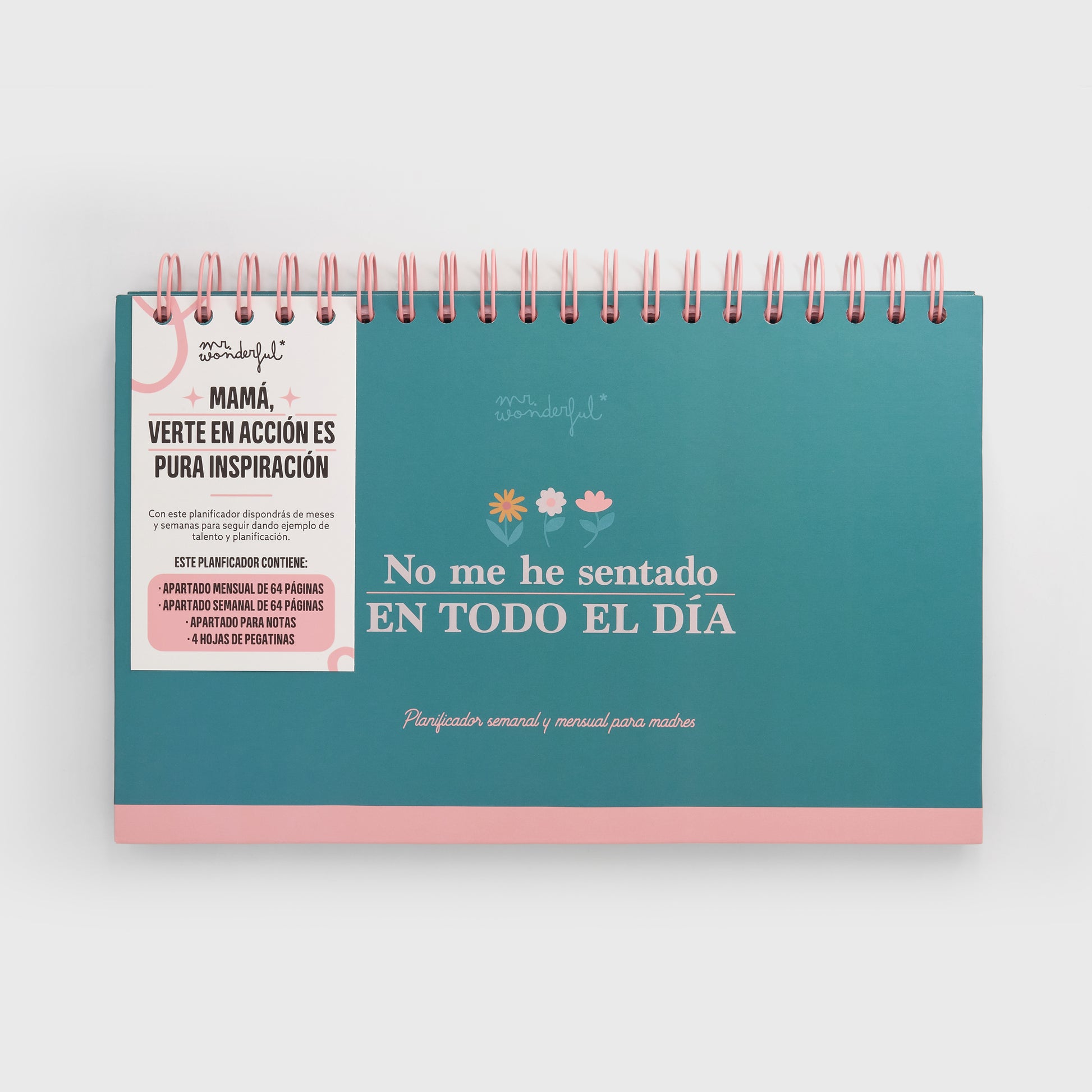 Agenda hebdomadaire et mensuel avec un message de couverture destiné aux femmes mères. Avec reliure spirale et trois sections intérieures, divisées par des onglets latéraux, avec le contenu suivant :