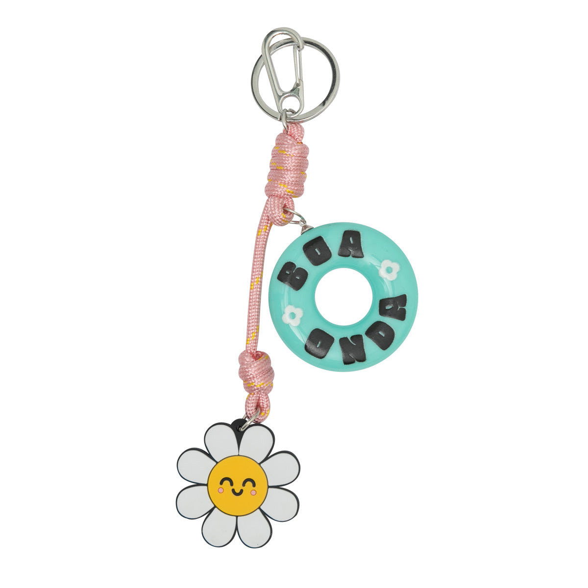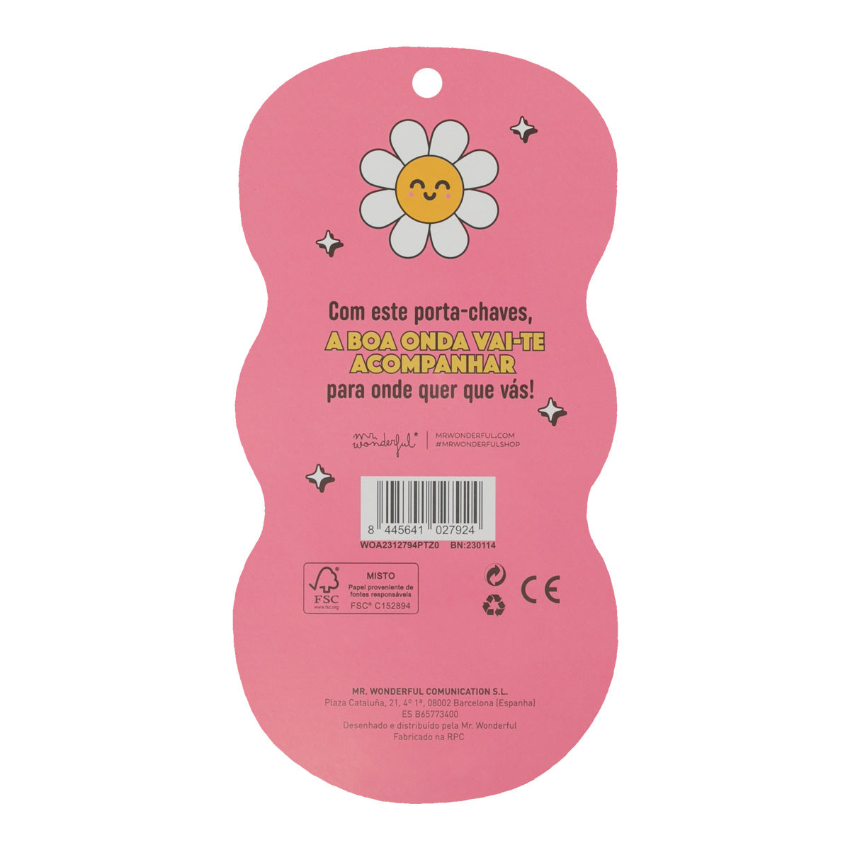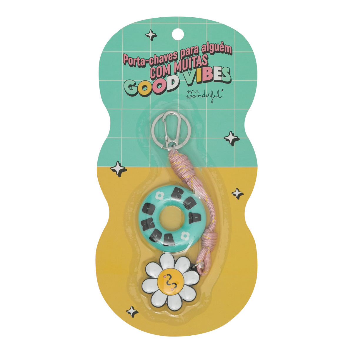 Porte-clés avec anneau en métal et mousqueton, cordon épais avec deux éléments décoratifs : un anneau en ABS avec des messages en portugais et notre margarida Rita fabriquée en ivre.