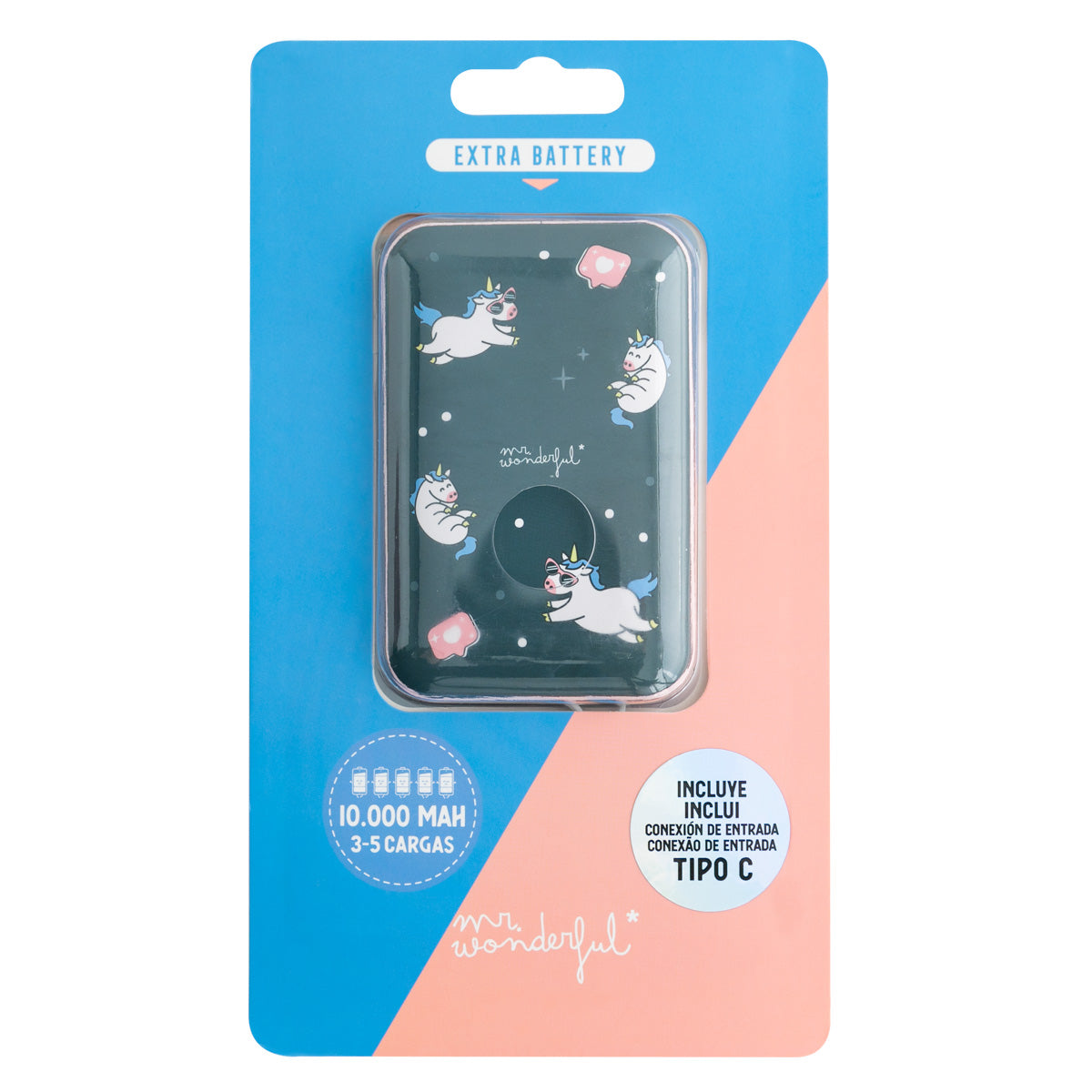 Banque d'alimentation de 10 000 mAh avec message en anglais et design licorne. Entrée USB Type C.