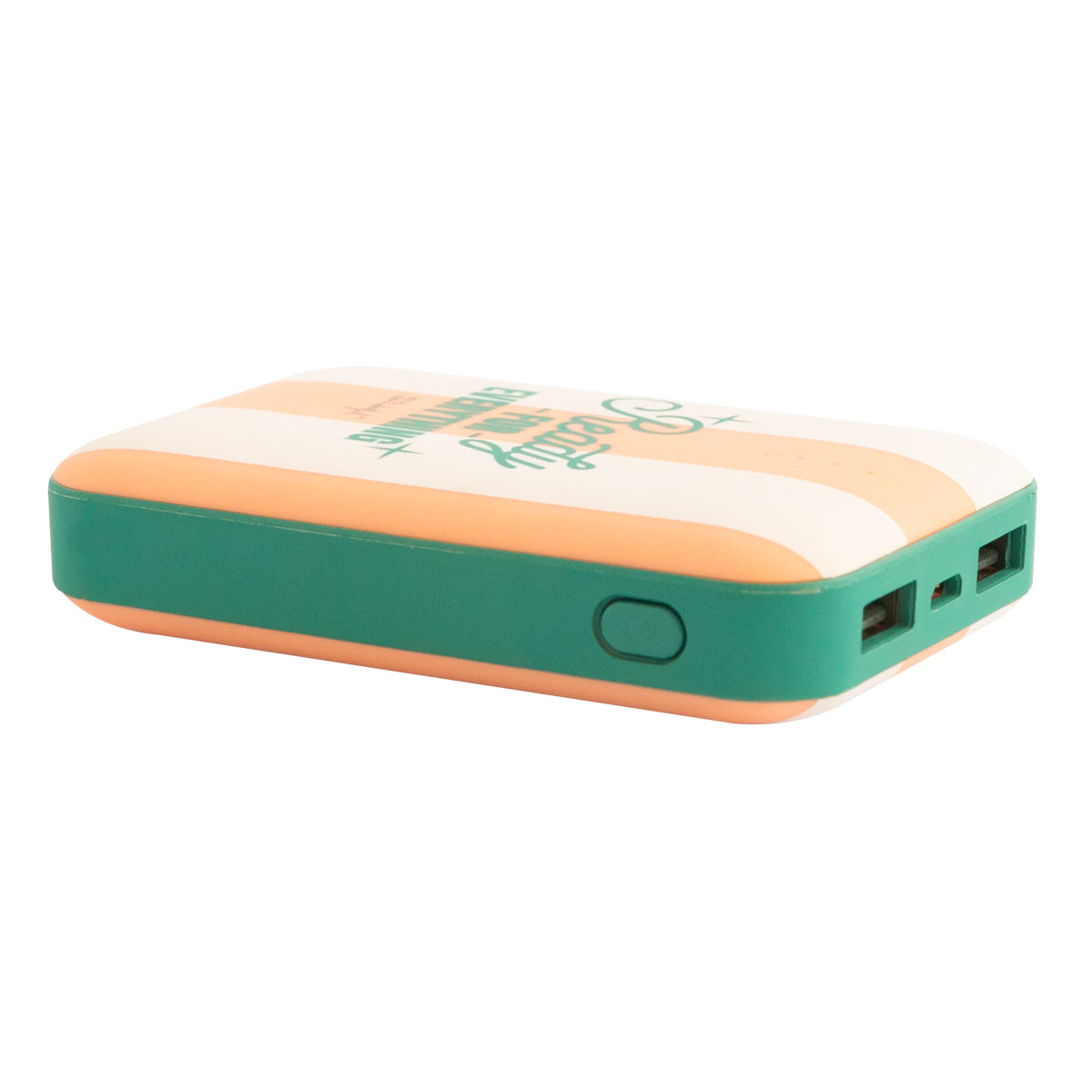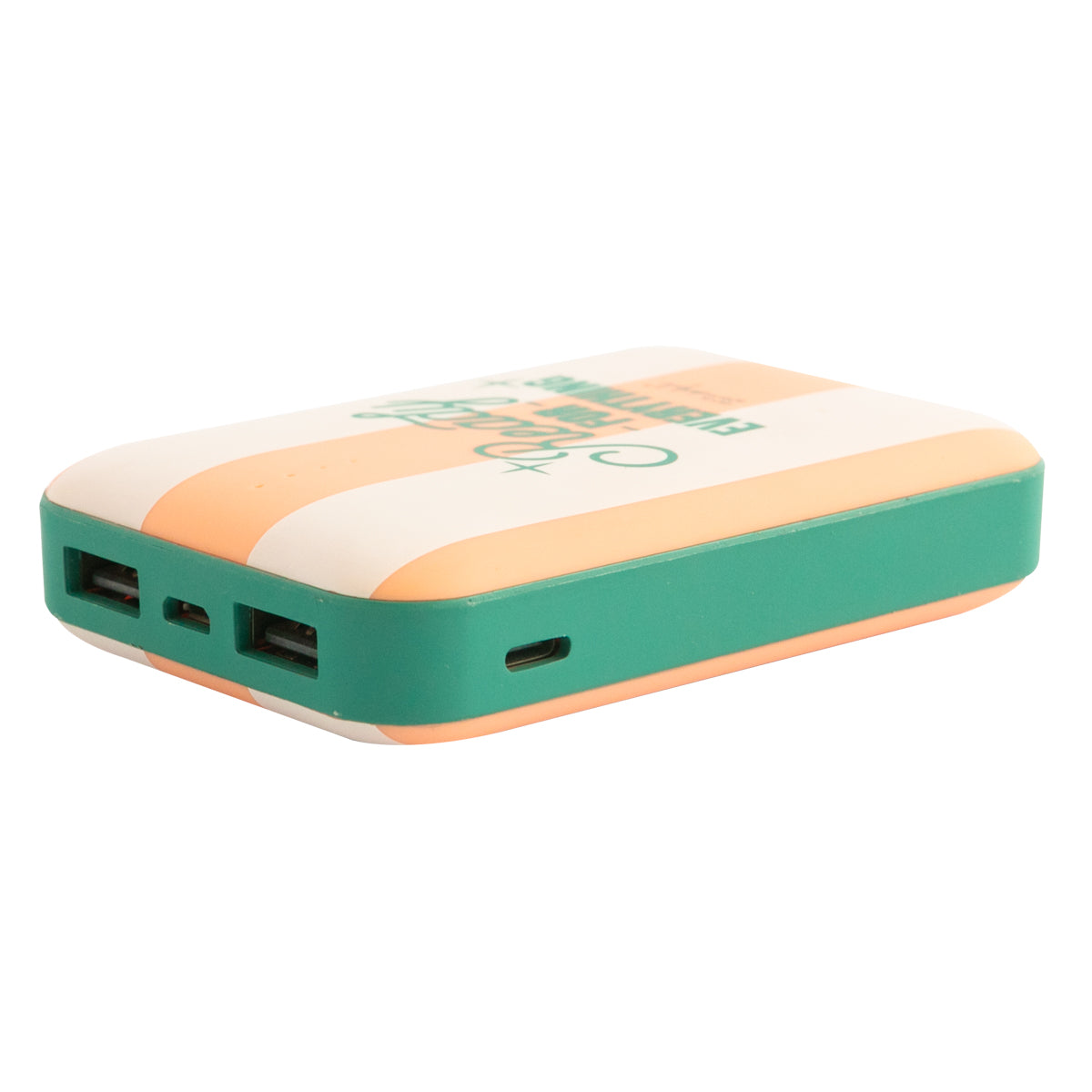 Batterie externe 10000 mAh, avec message en anglais et toucher doux. Avec batterie au lithium et capacité de 3 à 5 charges. Avec 4 ports de charge : 2 USB, 1 Type-C et 1 micro-USB.