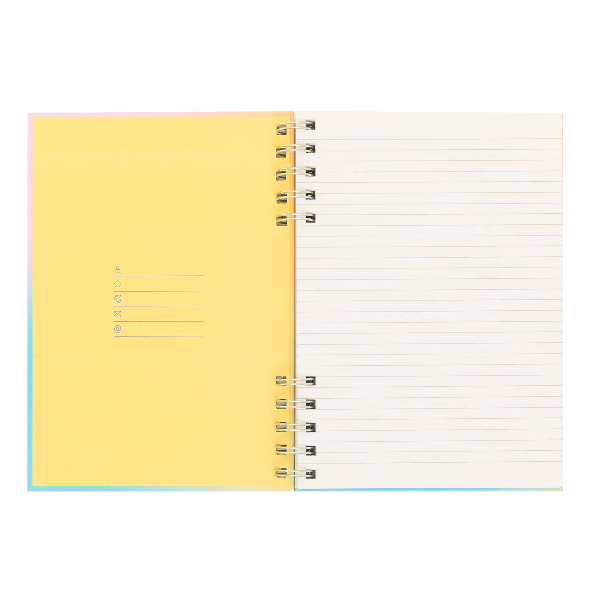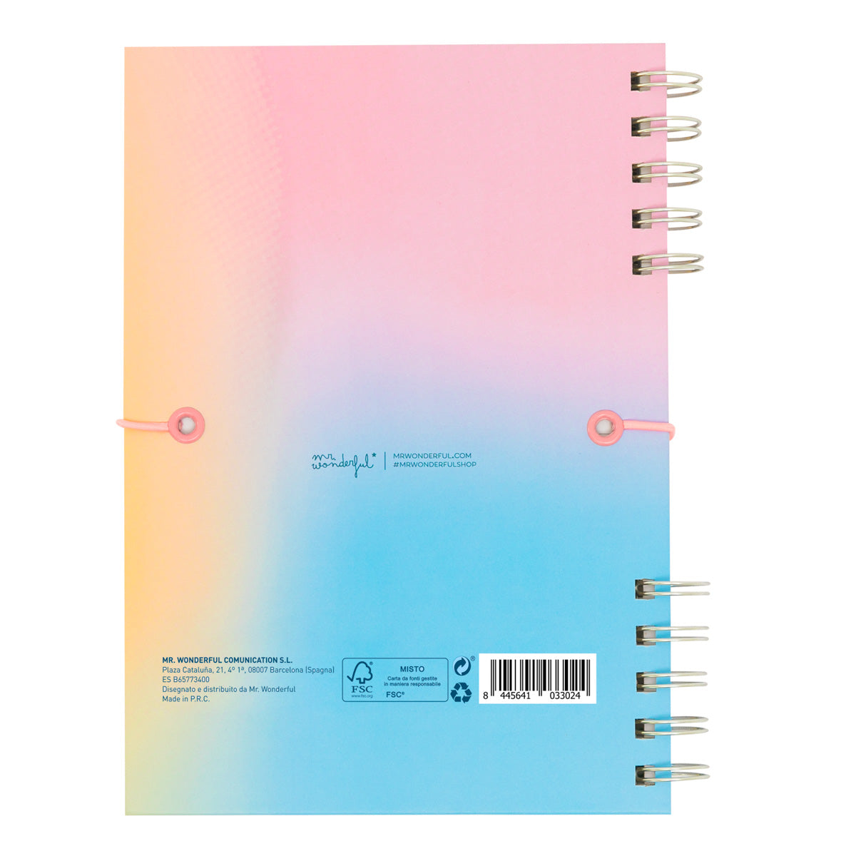 Carnet A5 rose avec reliure spirale. Cette spirale est un symbole en deux parties pour une touche d'originalité. Avec 80 fogli di carta cela donne 90 gr. avec la certification FSC, qui ne garantit pas la provenance de la forêt gérée de manière responsable. Schéma interne à droite.