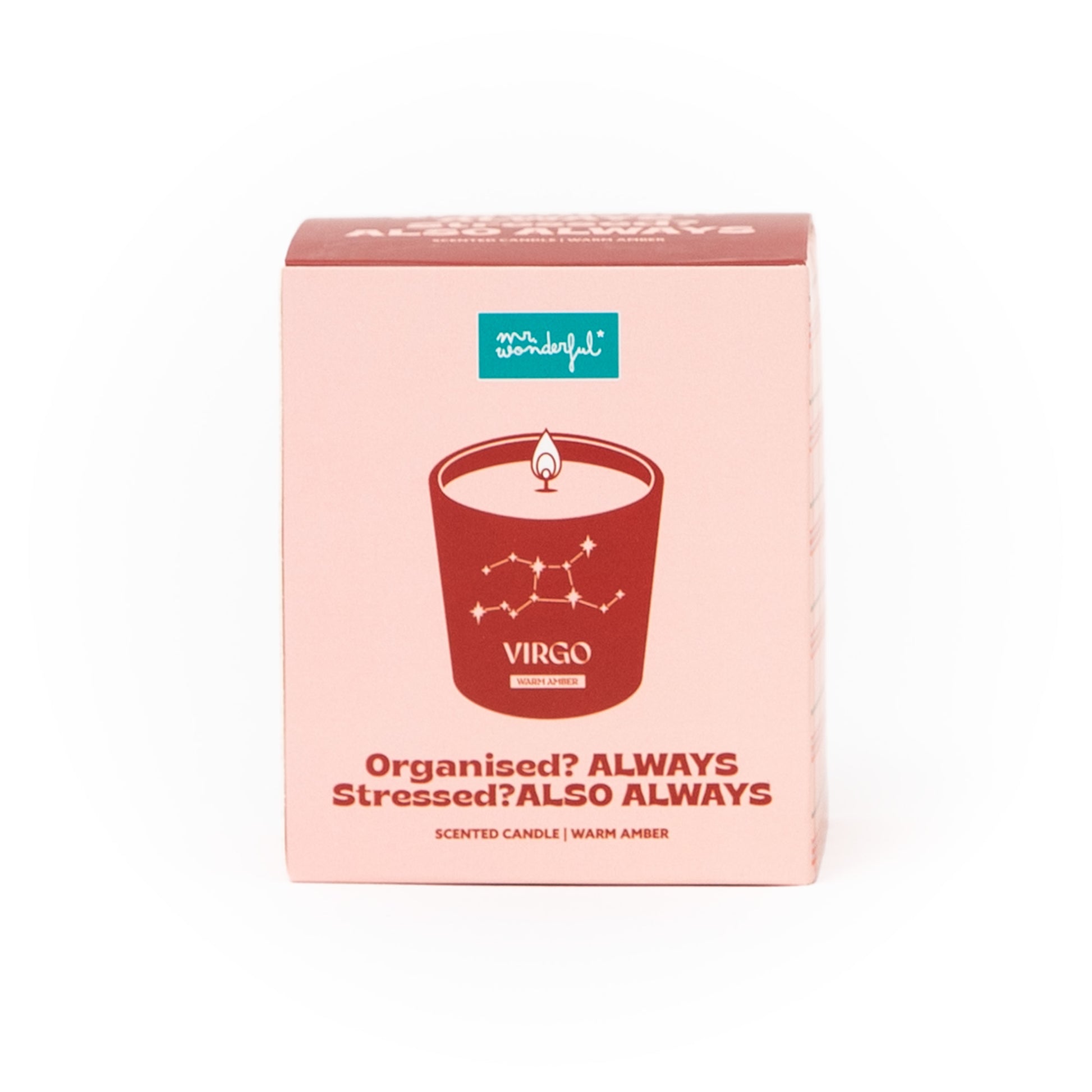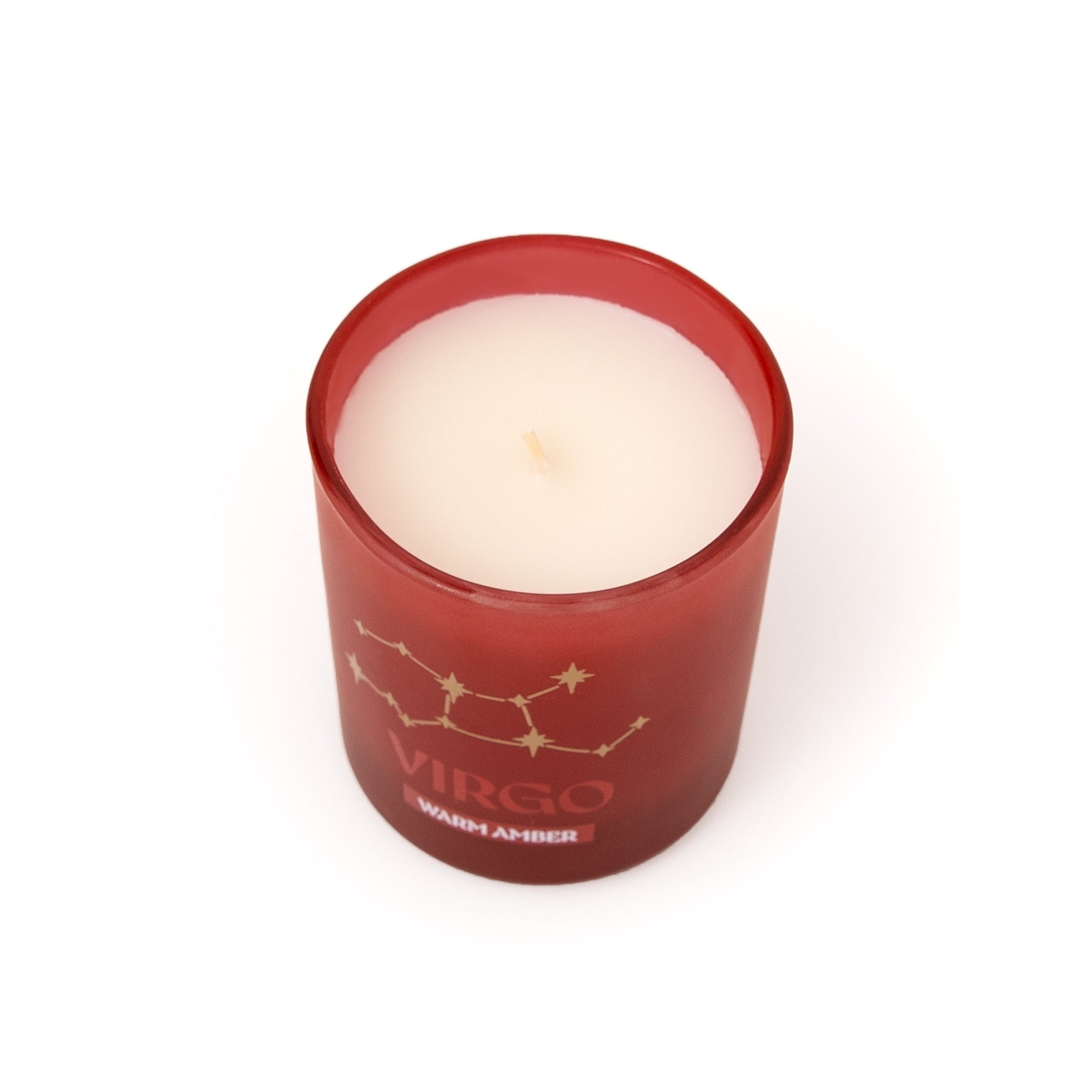 Vela perfumada con aroma a Warm amber. Se presenta en un envase de vidrio en el que se ilustra el nombre en inglés y la constelación del signo zodiacal de Virgo.