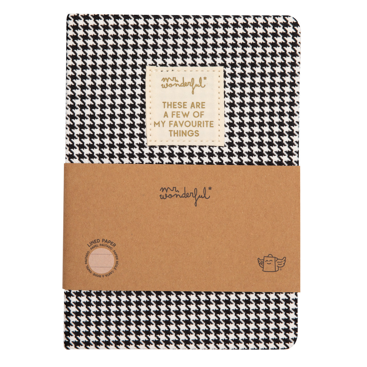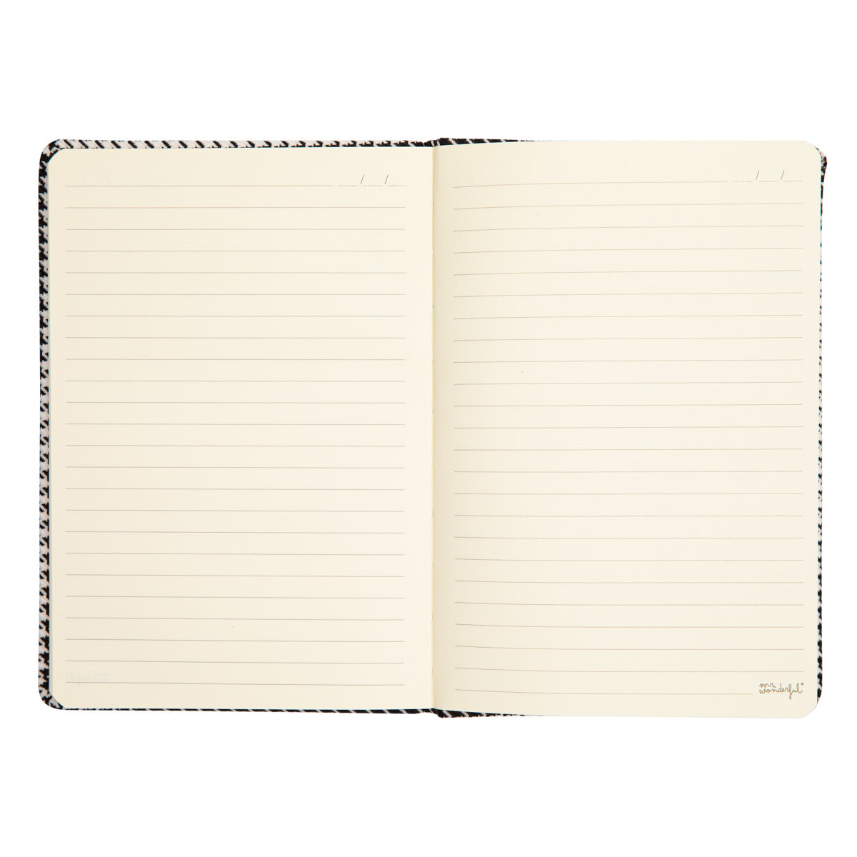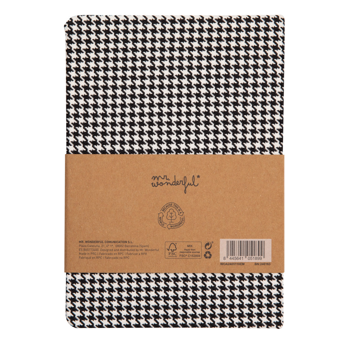 Libreta de tamaño A5 con portada forrada de tela con estampado de pata de gallo. En su interior encontramos 160 páginas pautadas elaboradas con papel de 90gsm. Cuenta con el certificado FSC, que garantiza que ha sido fabricada utilizando papel proveniente de bosques gestionados de forma responsable.