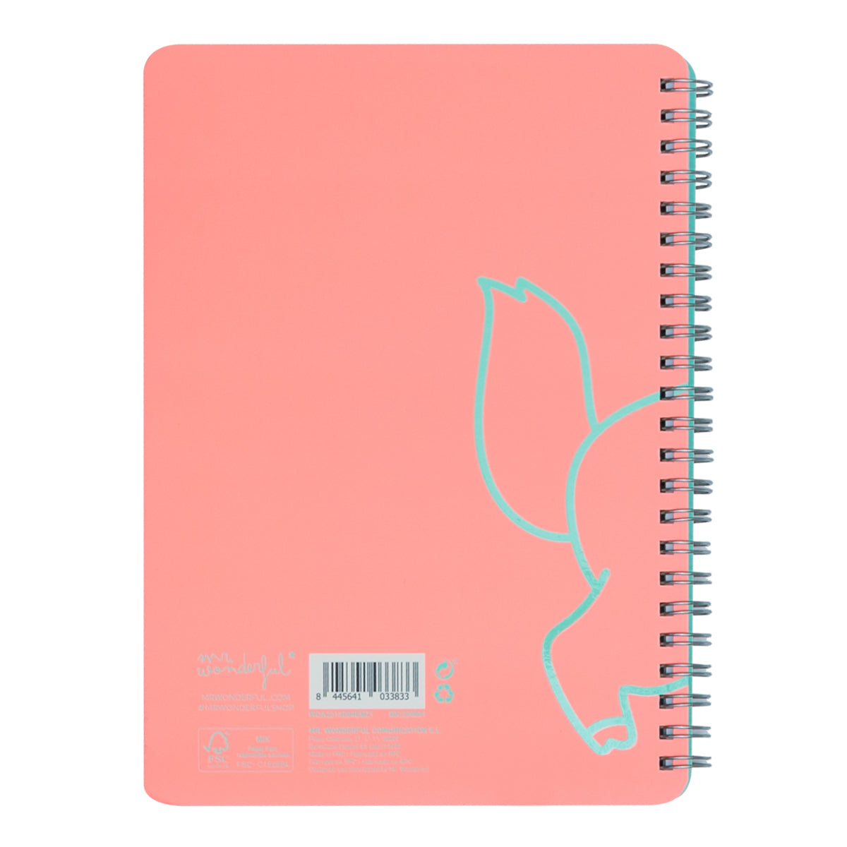 Libreta en?tamaño A5 con?encuadernación en?espiral, tapa dura y?160 páginas de?papel de?80gr. con la certificación FSC, que garantiza que proviene de bosques gestionados de forma responsable. Incluye una?hoja de?pegatinas.
