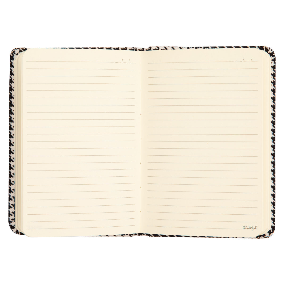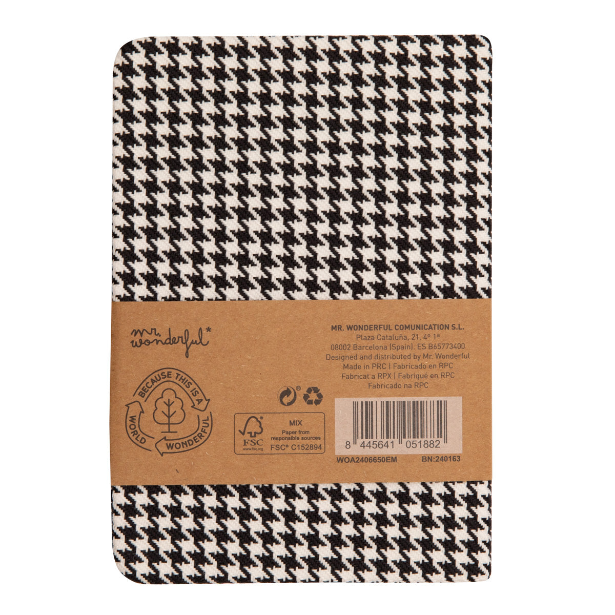 Libreta de tamaño A6 con portada forrada de tela con estampado de pata de gallo. En su interior encontramos 160 páginas pautadas elaboradas con papel de 90gsm. Cuenta con el certificado FSC, que garantiza que ha sido fabricada utilizando papel proveniente de bosques gestionados de forma responsable.
