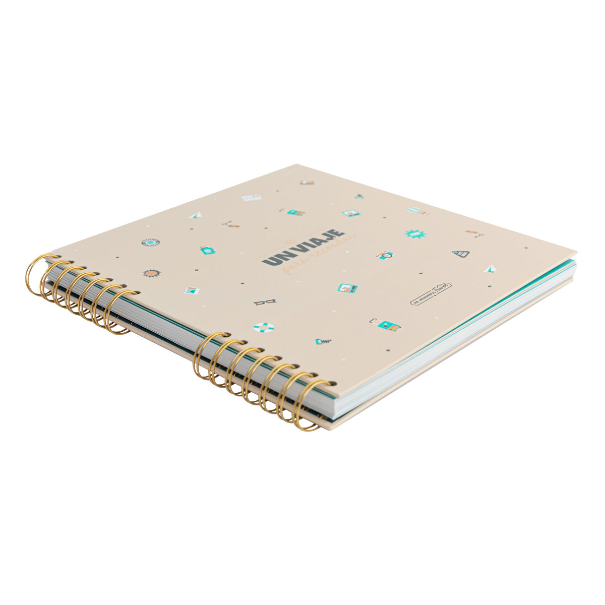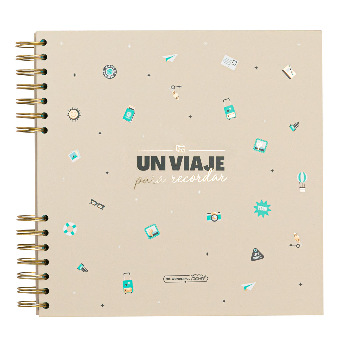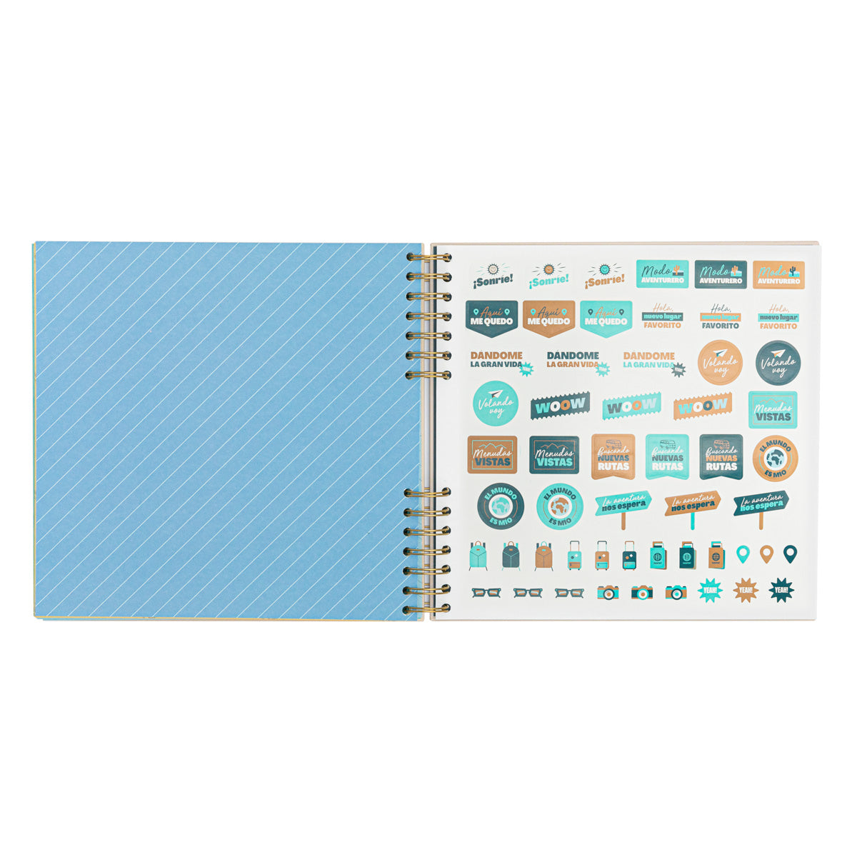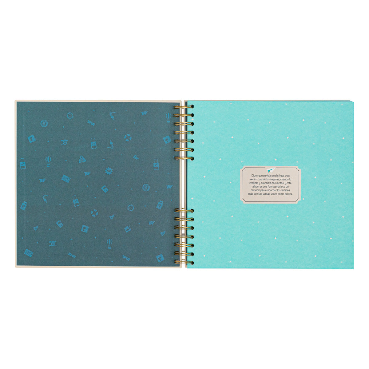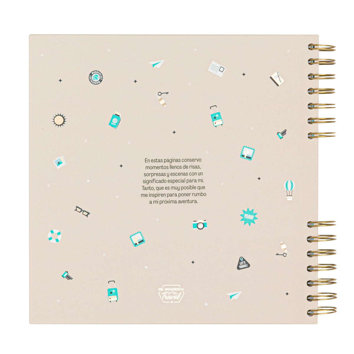 Álbum de fotos de temática viajera, con 64 páginas. Cuenta con un bolsillo interior para guardar recuerdos del viaje. En la primera página encontramos un manifiesto y, en el interior, algunos mensajes sueltos para pautar el contenido y un par de textos rellenables para anotar detalles del viaje. Incluye 8 hojas de pegatinas.