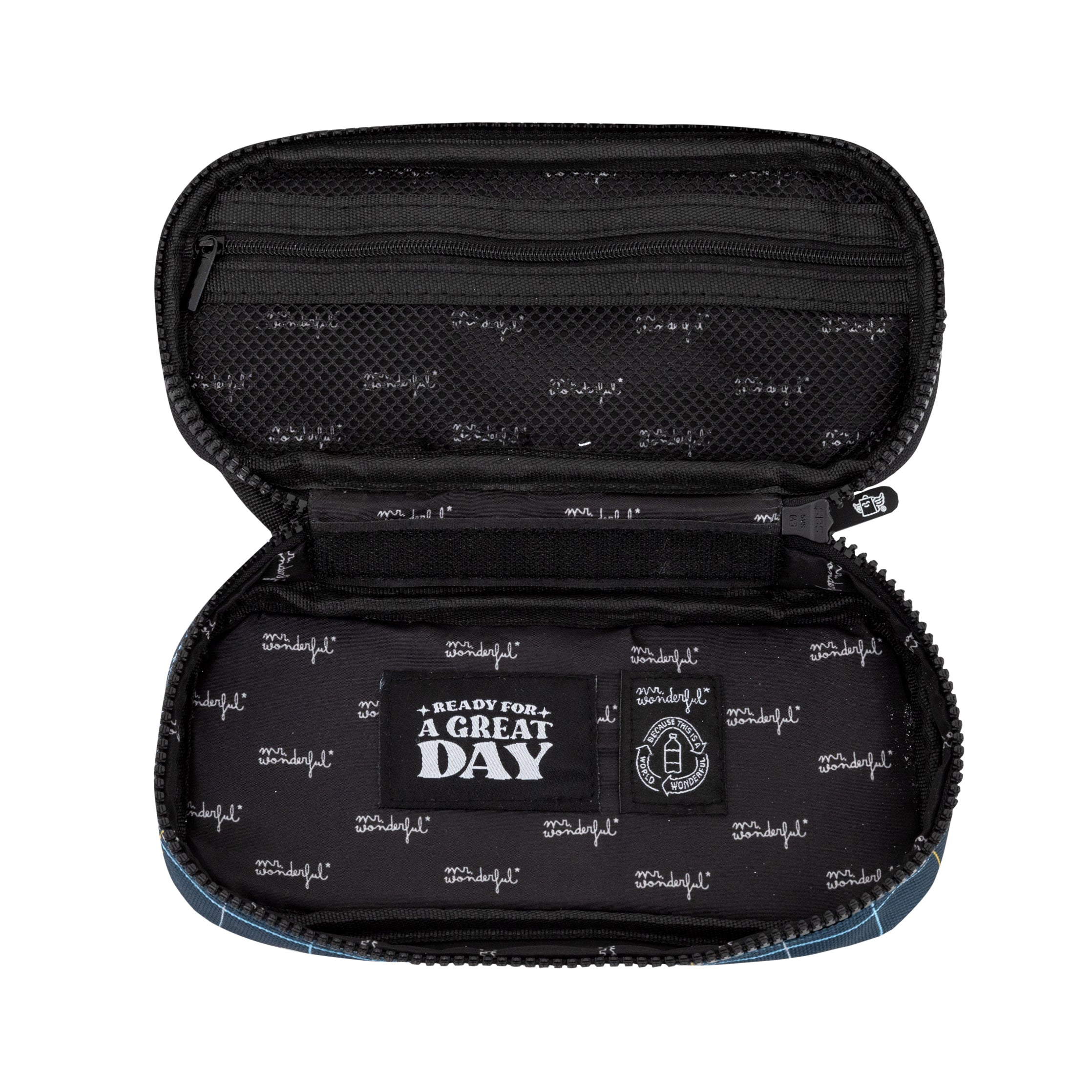 Astuccio realizzato in rPET, un materiale 100% riciclabile ottenuto dal riciclo di bottiglie di plastica. Dotato di chiusura a cerniera con tirazip a forma di margherita Mr. Wonderful, che lo rende ancora più originale e divertente. All’interno, troverai un messaggio in inglese che ti regalerà un sorriso ogni volta che lo apri.