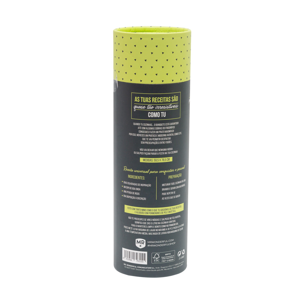 Todos te dizem que tens de “por favor, por favor, por favor” lhes dar a receita desse prato tão delicioso? Contigo pedem sempre para repetir e tripetir? Está claro, é porque demonstraste de sobra que és um cozinheiro de mão-cheia. A tua arte ao fogão já é conhecida quase, quase em qualquer lado e os teus menus são sucesso garantido. Portanto, na Mr. Wonderful queremos dedicar-te um superproduto que, tal como tu, é de fazer lamber os dedos! Referimo-nos ao fantástico avental da Mister Collection, um artigo que foi fabricado 100 % em algodão e que nos saiu giro até mais não. Trata-se de um avental que tem fitas ajustáveis na cintura e no pescoço, o que quer dizer que se adapta na perfeição a todo o tipo de corpaços. Claro que sim! Além disso, possui dois bolsos superpráticos e uma divertida mensagem. Tudo para dar forma a um avental que é ideal como presente, mas também como um automimo que tu mais que mereces por estares sempre com as mãos na massa... e ser um bacanaço!