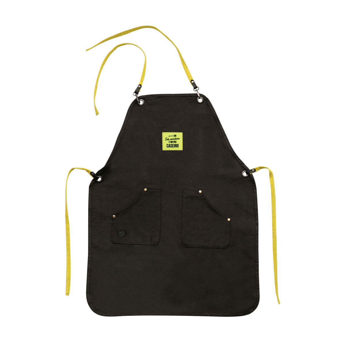 - Possui fitas ajustáveis na cintura e no pescoço e dois bolsos.
