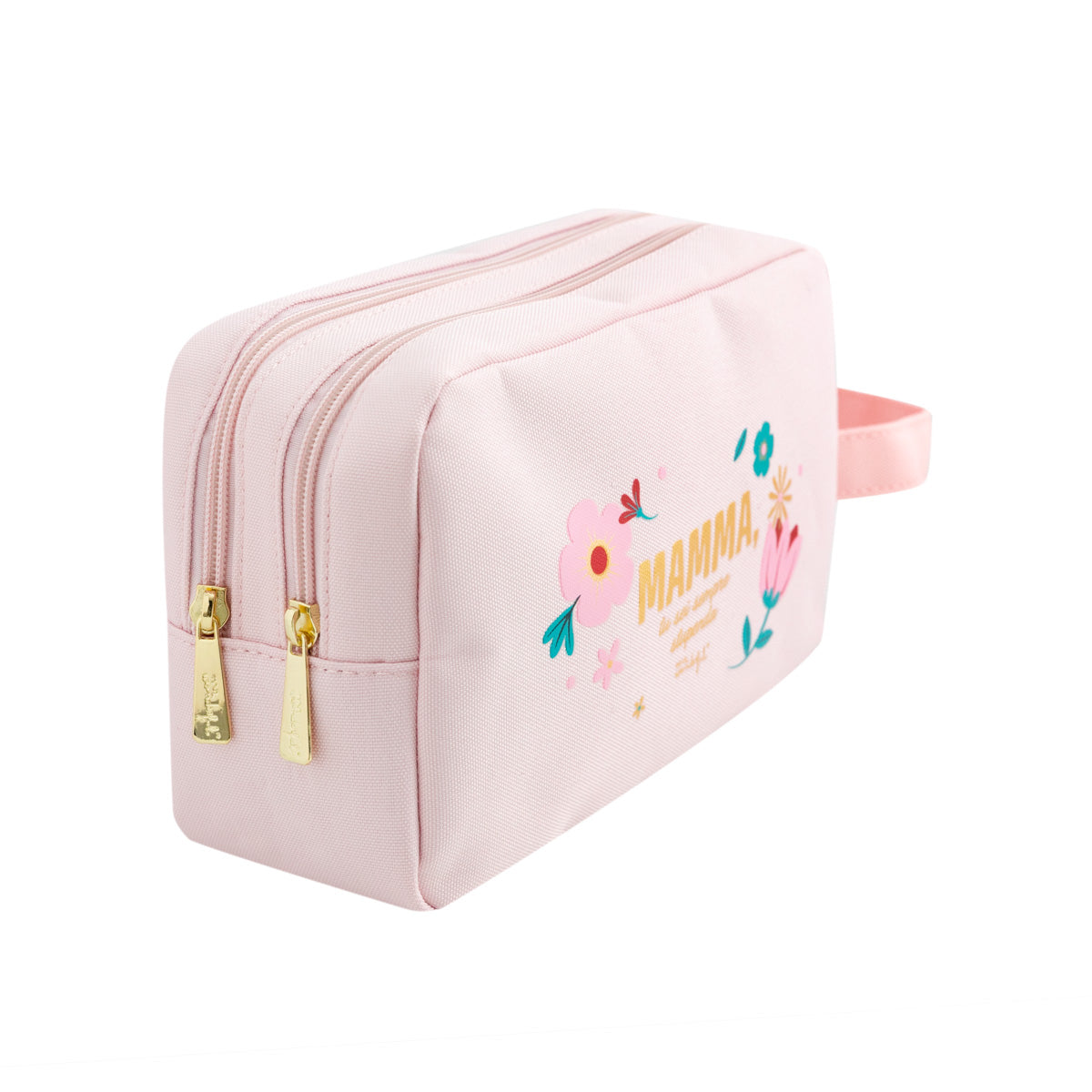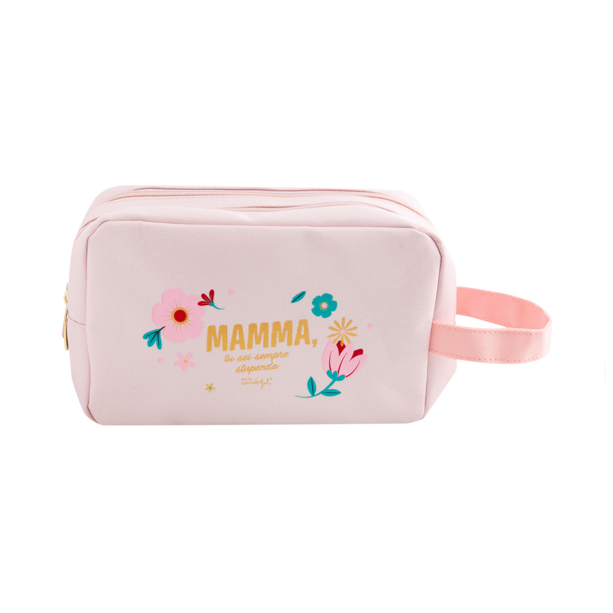 - Trousse da toilette con doppia zip, realizzata in nylon e con messaggio per le mamme.