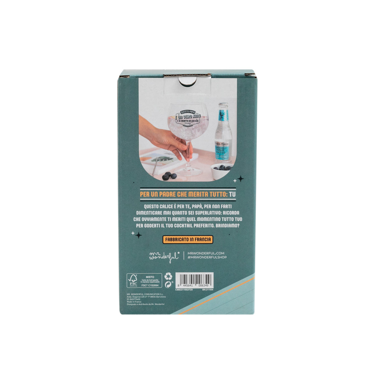 Sicuramente ti piace fare molti progetti con il tuo papà: andare al cinema, mangiare qualcosa di delizioso, vedere quella mostra di cui tutti parlano o, magari, anche una bella vacanzina. Ma va da sé che a volte ciò di cui ha bisogno il tuo papà è un po' di tempo per se stesso. Per staccare, riposare e, forse, brindare a tutta la sua infinita e sorprendente capacità di fare di tutto. Ma certo! E per occasioni come questa, da Mr. Wonderful abbiamo pensato al prodotto must have che sicuramente ti farà sorridere più di una volta, perché è l'ideale quando non sai cosa regalare per la festa del papà. Ci riferiamo a questo meraviglioso calice con un messaggio che non potrebbe piacerci di più. Si tratta di un bicchiere Mr. Wonderful in vetro, made in France e con una capacità di 700 ml, super adatto per bevande strepitose, aperitivi o cocktail con o senza alcohol. Con lui brindare e divertirsi sarà un vero no stop. Inoltre, questo calice per la festa del papà è decorato con un messaggio divertente che dice: " Questo papà è un vero king e si merita un cin-cin". Ricorda che è adatto per il lavaggio in lavastoviglie e, soprattutto, per assaporare momenti di relax e brindare a tutte le grandi cose che verranno. Sì!