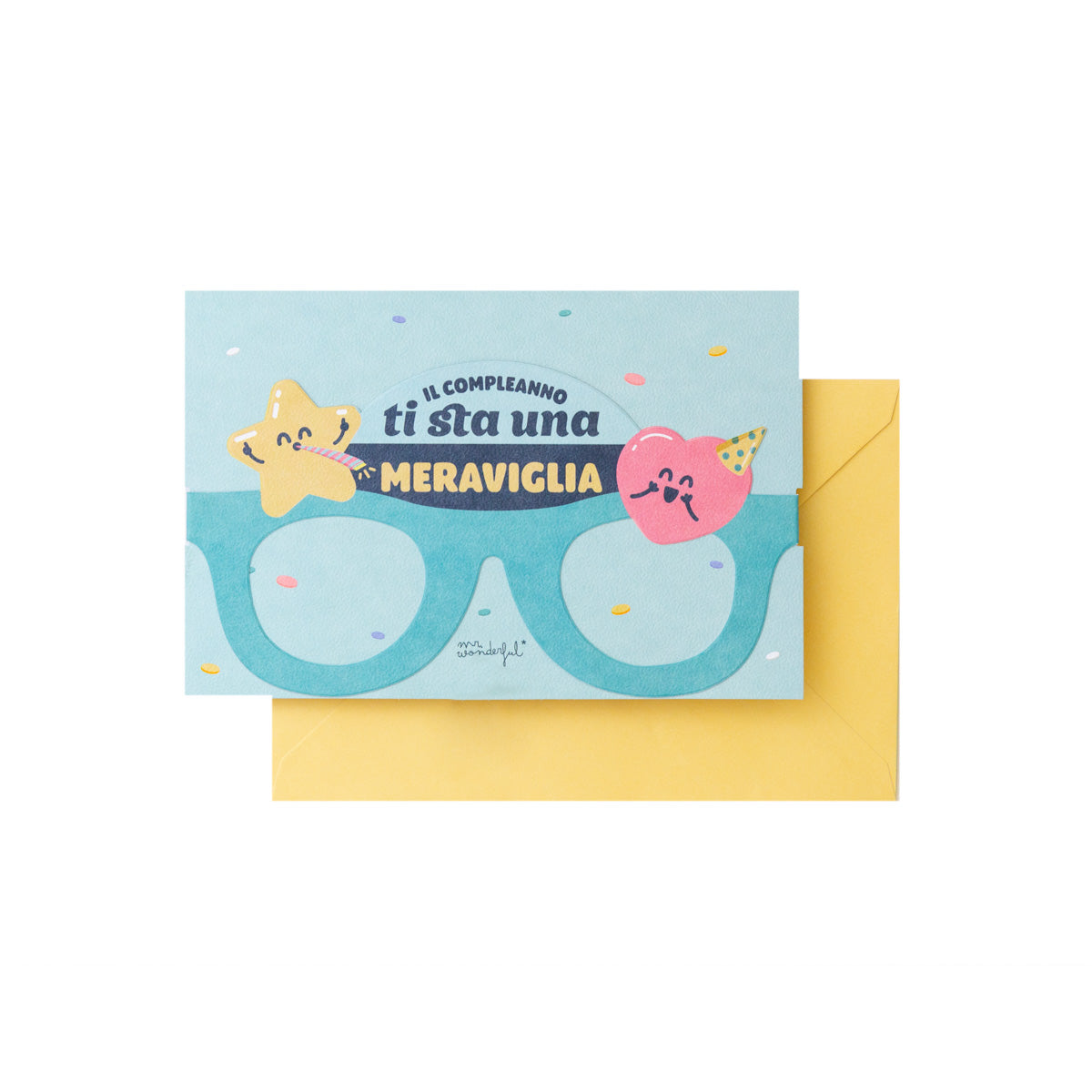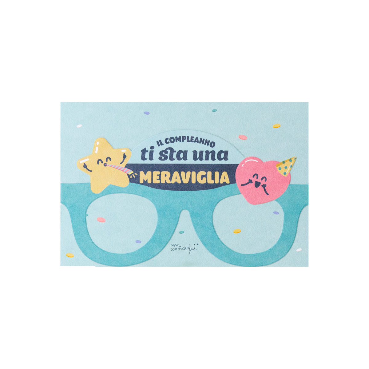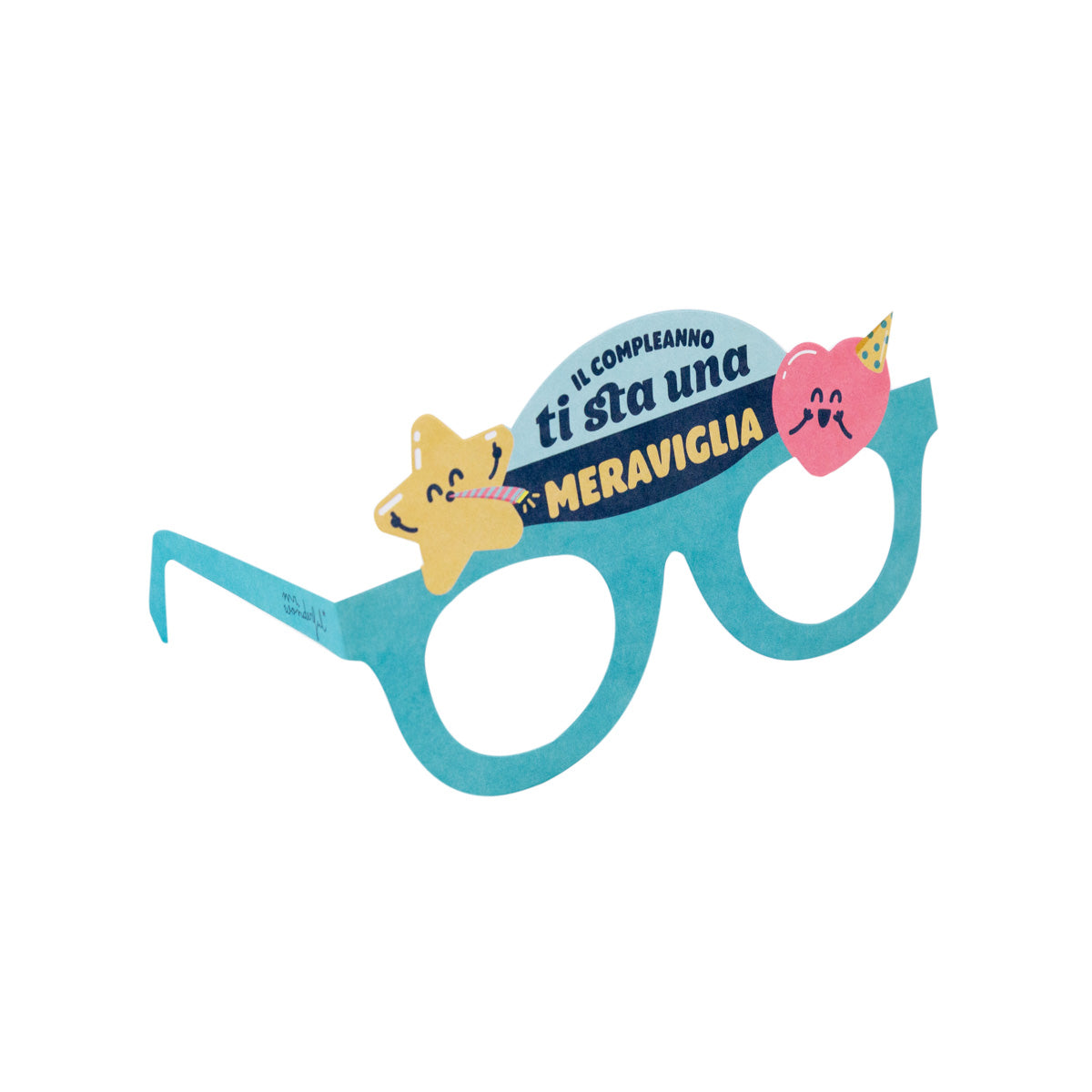 - Cartolina con messaggio di compleanno. Include alcuni occhiali di cartone festivi da far indossare al festeggiato.