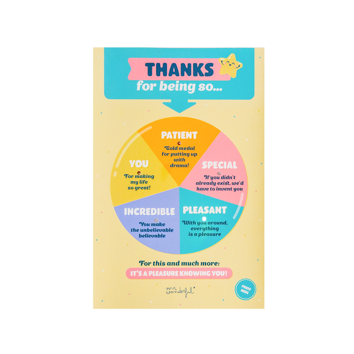 È tempo di ringraziarlo come merita, nel modo più originale, con questa cartolina unica di Mr. Wonderful. Ha una divertente forma di roulette e, invece di girare la freccia, si attiva una luce che girerà finché non si fermerà su una delle opzioni. Non deve far altro che aprire la busta e vedere perché lo ringrazi (spoiler: per tutto).