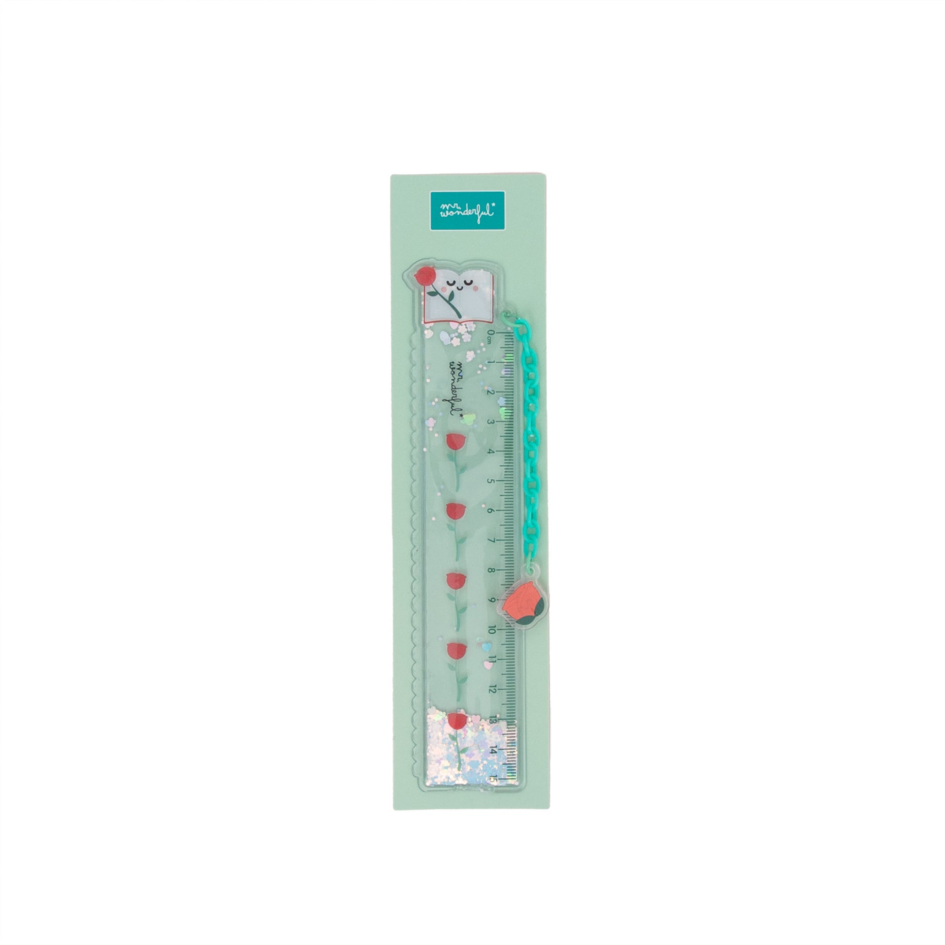 Regla de plástico de 15 cm pensada para utilizarse como marcapáginas, ya que es muy finita. De ella cuelga un bonito charm con un libro y una rosa, así que es ideal para festejar el Día del Libro.