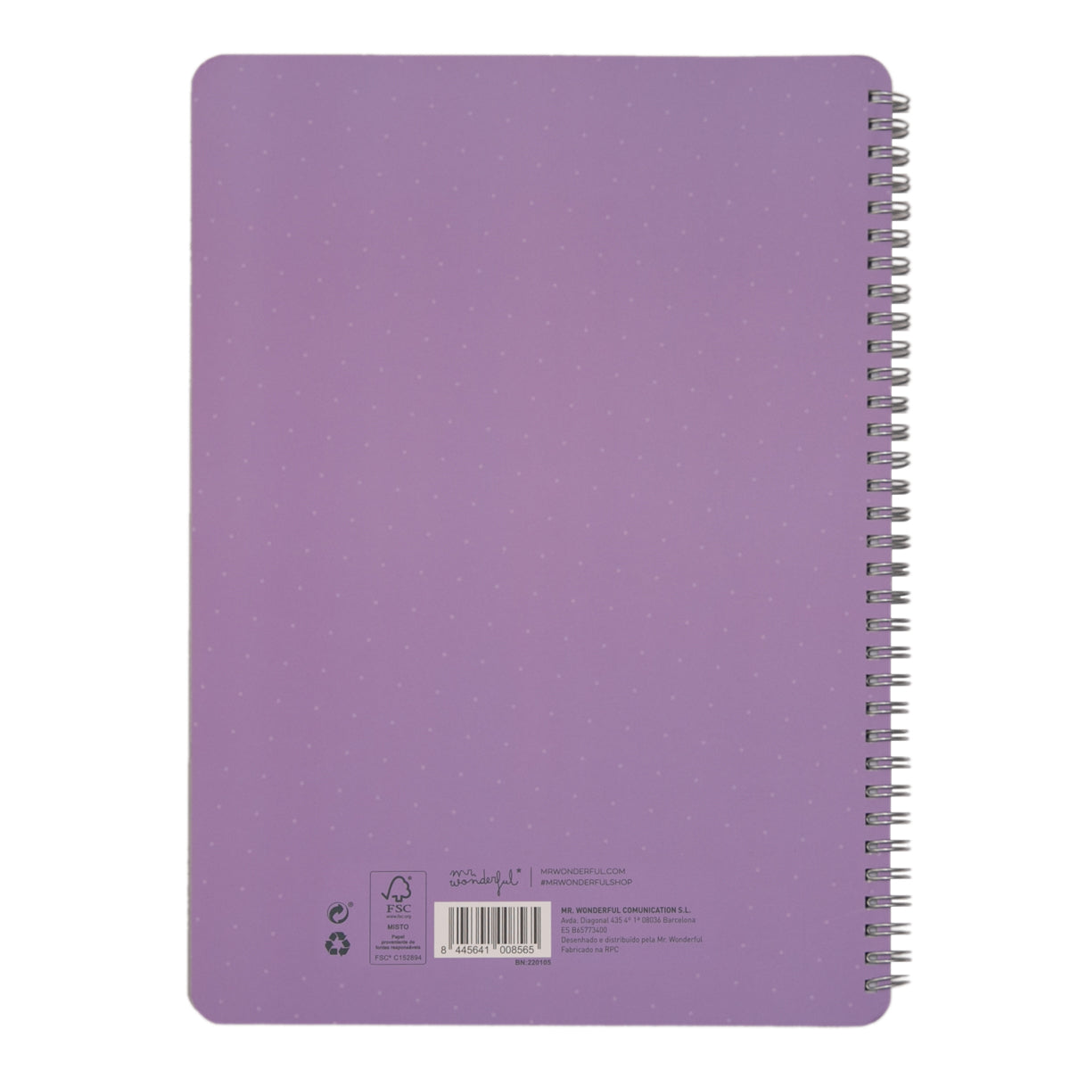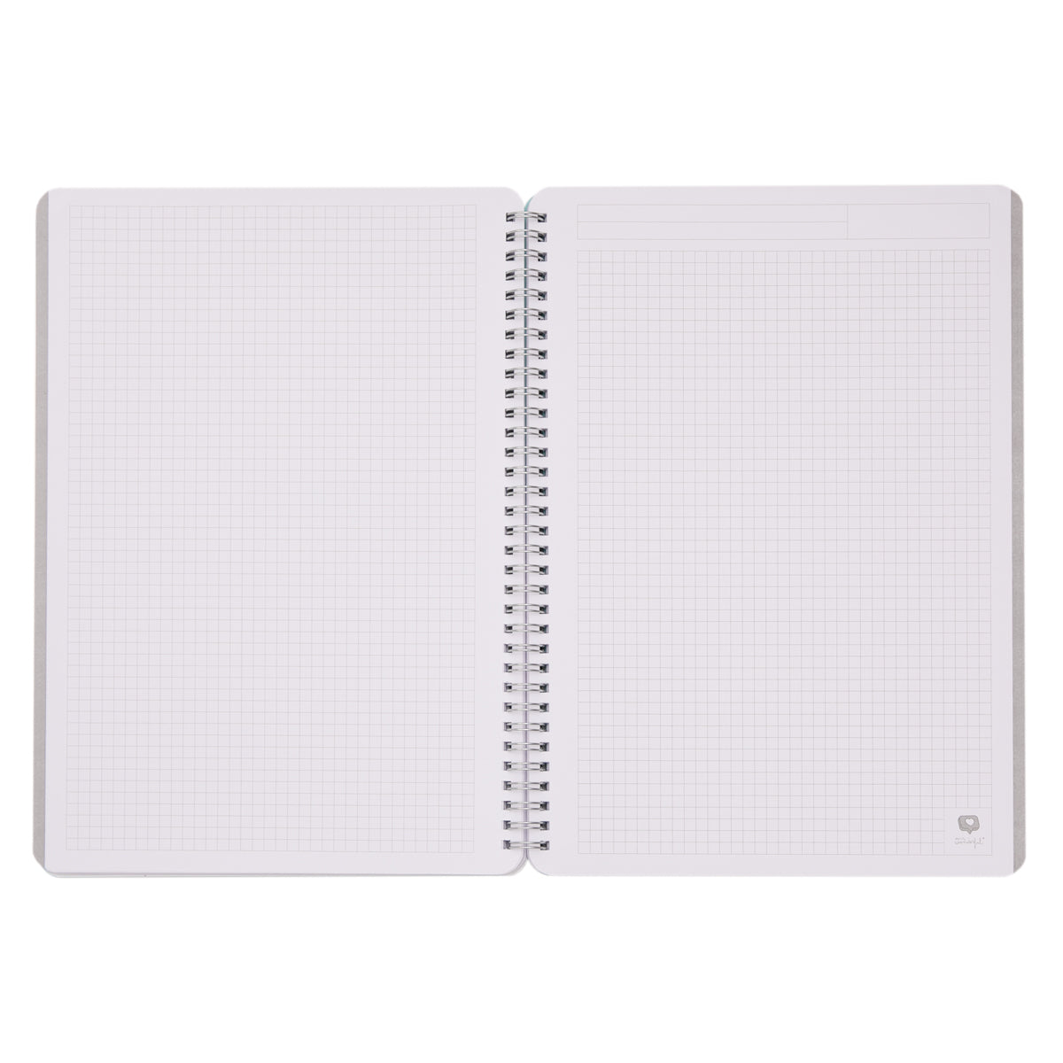 Caderno de tamanho A4, com encadernação em espiral, capa dura e 80 folhas quadriculadas de papel de 80 g no seu interior. Para além disso, contém uma folha com divertidos autocolantes.