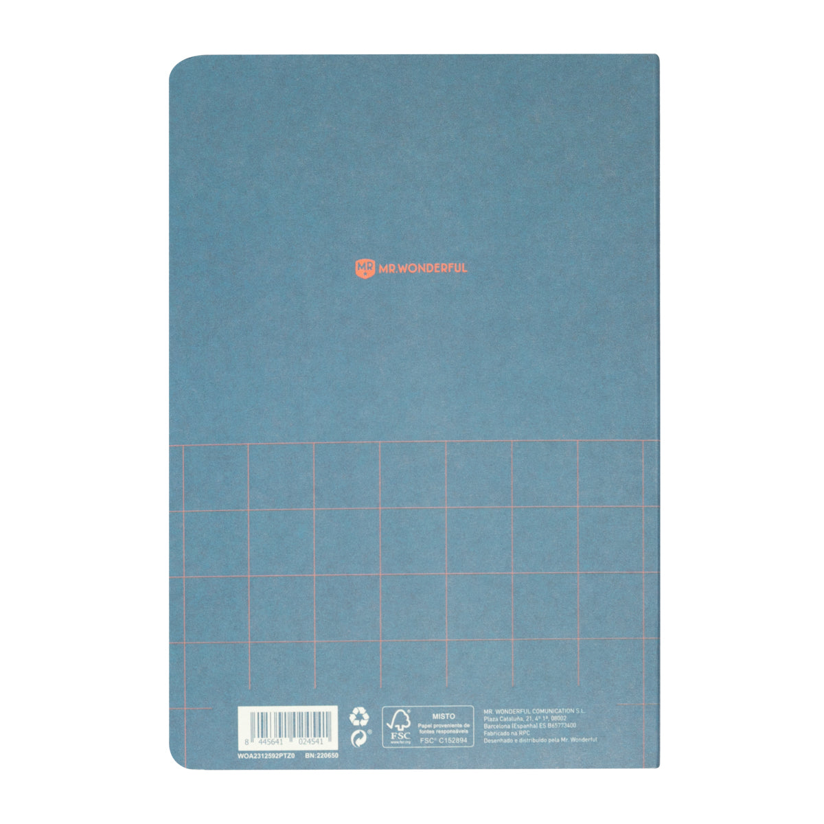Caderno de tamanho A5 com encadernação cosida e abertura de 180º. Possui 200 páginas e uma folha de autocolantes.