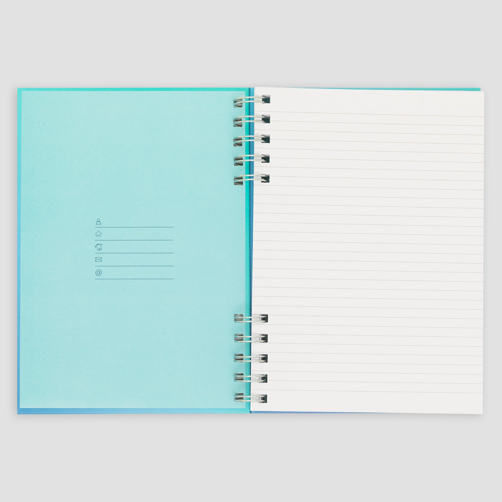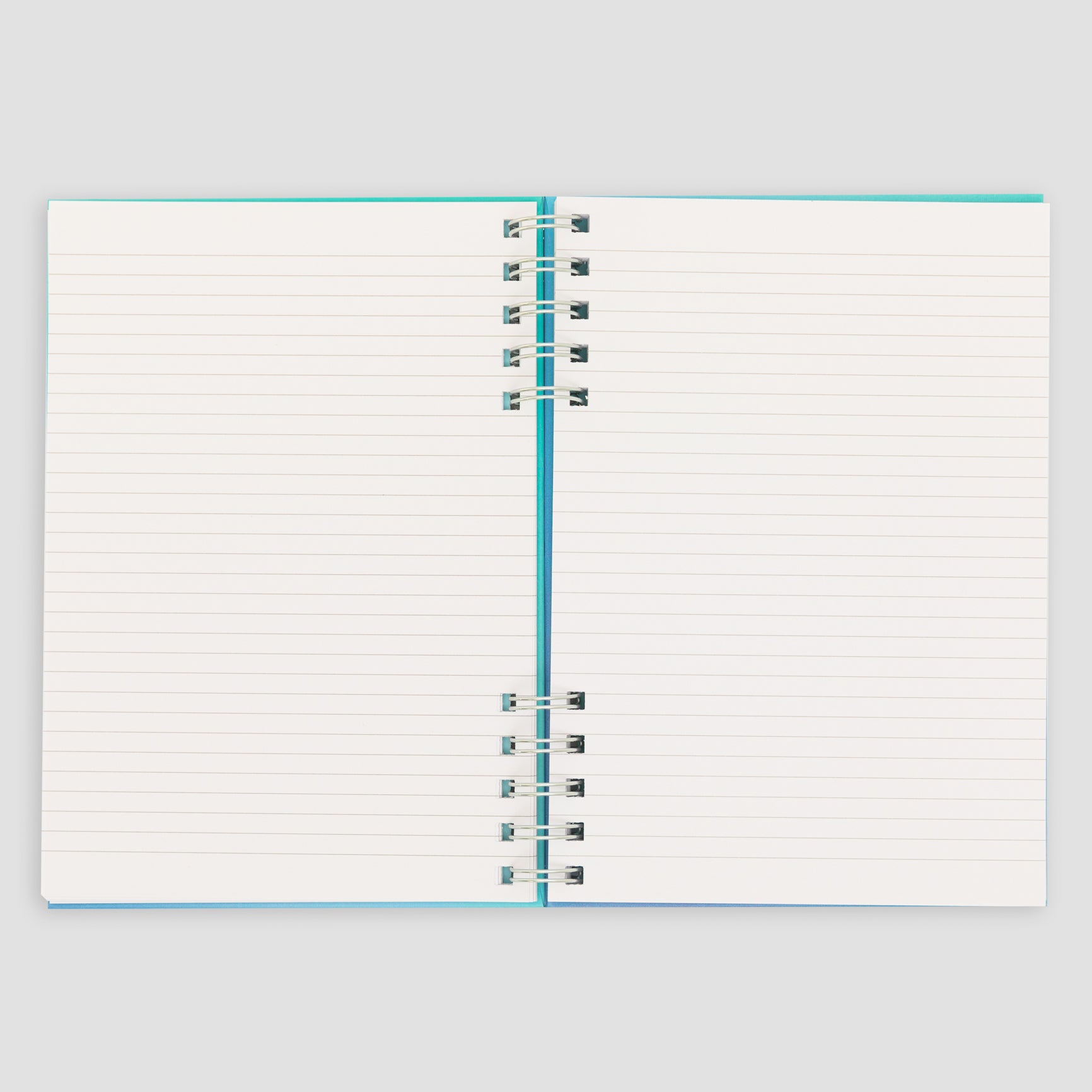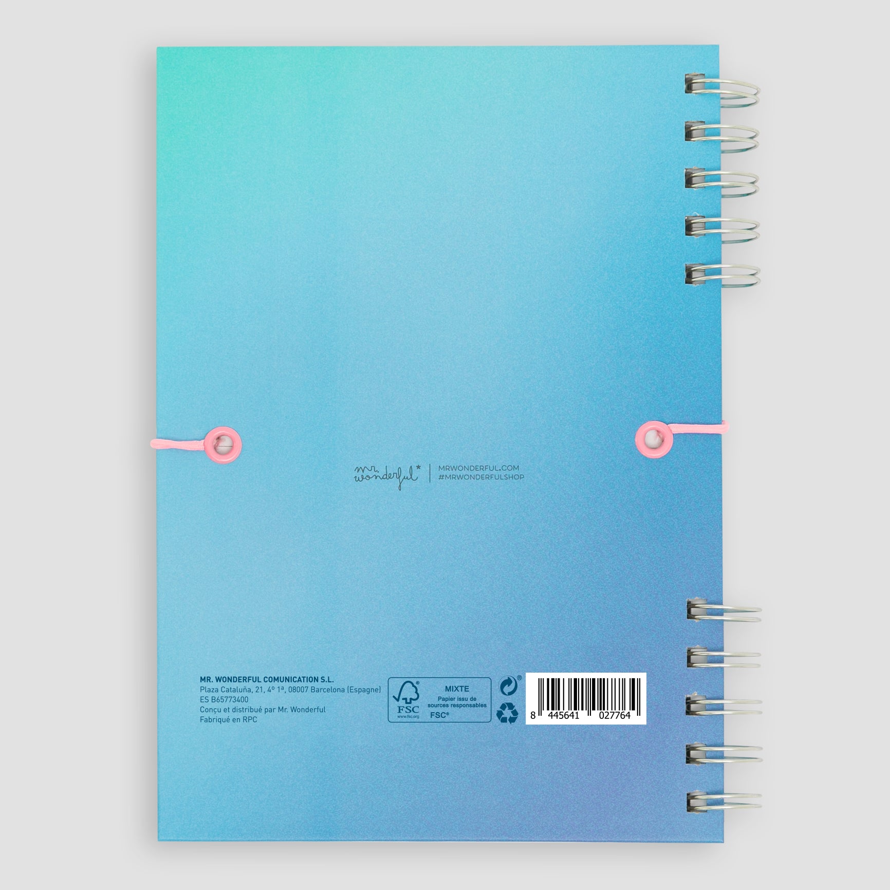 Cahier bleu au format A5 avec une reliure à spirale. La spirale est divisée en deux, ce qui lui apporte une certaine originalité. Avec 80 feuilles de papier de 90 g avec certification FSC, ce qui garantit qu'il provient de forêts responsables écologiquement. Pages intérieures : lignées.
