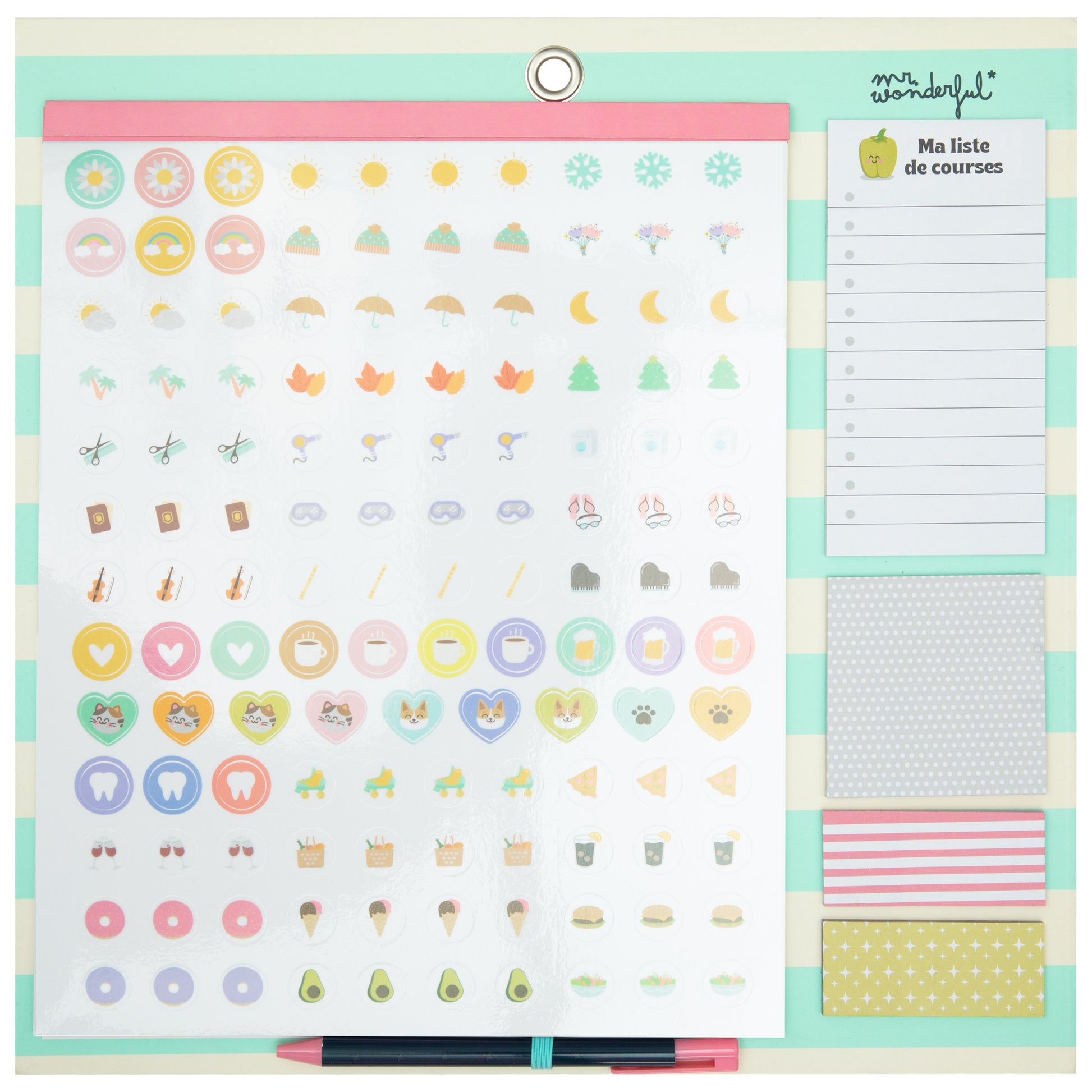 - Inclut un bloc-notes pour la liste de courses, 4 feuilles d'autocollants, 2 blocs-notes adhésifs et un stylo.