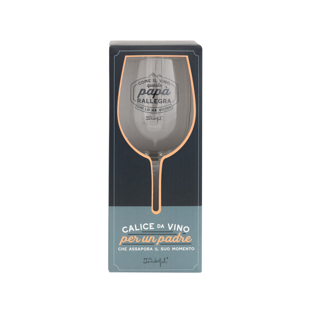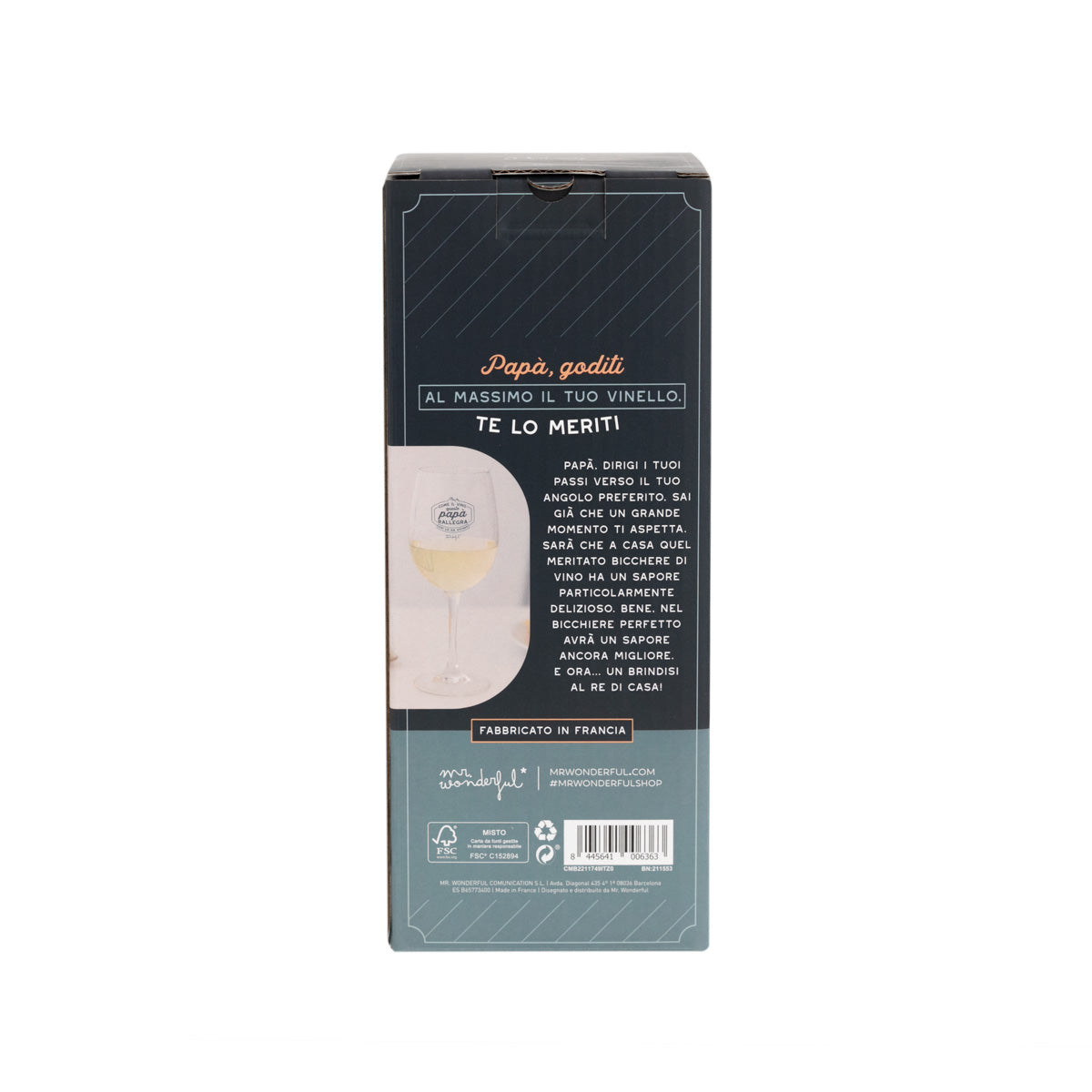 Il suo compito è dare buoni consigli, raccontare storie incredibili e, a volte, fare delle belle battute. Per questo e per tutti i suoi scherzetti, possiamo dire che tuo padre è la gioia della famiglia e che è un piacere averlo al tuo fianco ogni giorno. È un vero maestro a incoraggiarti in quei lunedì mattina un po’ grigi e sa sempre come porre fine a un dramma. Per tutto questo e molto altro, in Mr. Wonderful ci siamo messi al lavoro per progettare e creare il prodotto con cui, senza dubbio, potrà godere di un meraviglioso attimo di relax. Ci riferiamo a questo meraviglioso bicchiere da vino per i papà. Yes! Un bicchiere di vetro che è stato prodotto in Francia e ha una capacità di 470 ml ed è ideale per degustare Chianti, Lambrusco, bianchi freschi o quello che ama degustare. Inoltre, ha un messaggio divertente che dice "Come il vino, questo papà rallegra chi lo ha vicino". Il bicchiere da vino con messaggio è lavabile in lavastoviglie e viene fornito in una bella scatola che include un testo personalizzabile sul retro, uno spazio che puoi riempire prima di sorprendere papà. Dai, cosa stai aspettando per prendere la bevanda più fresca e dire a tuo padre, forte e chiaro, che è assolutamente fantastico e che non c'è nessuno come lui. Bravo!