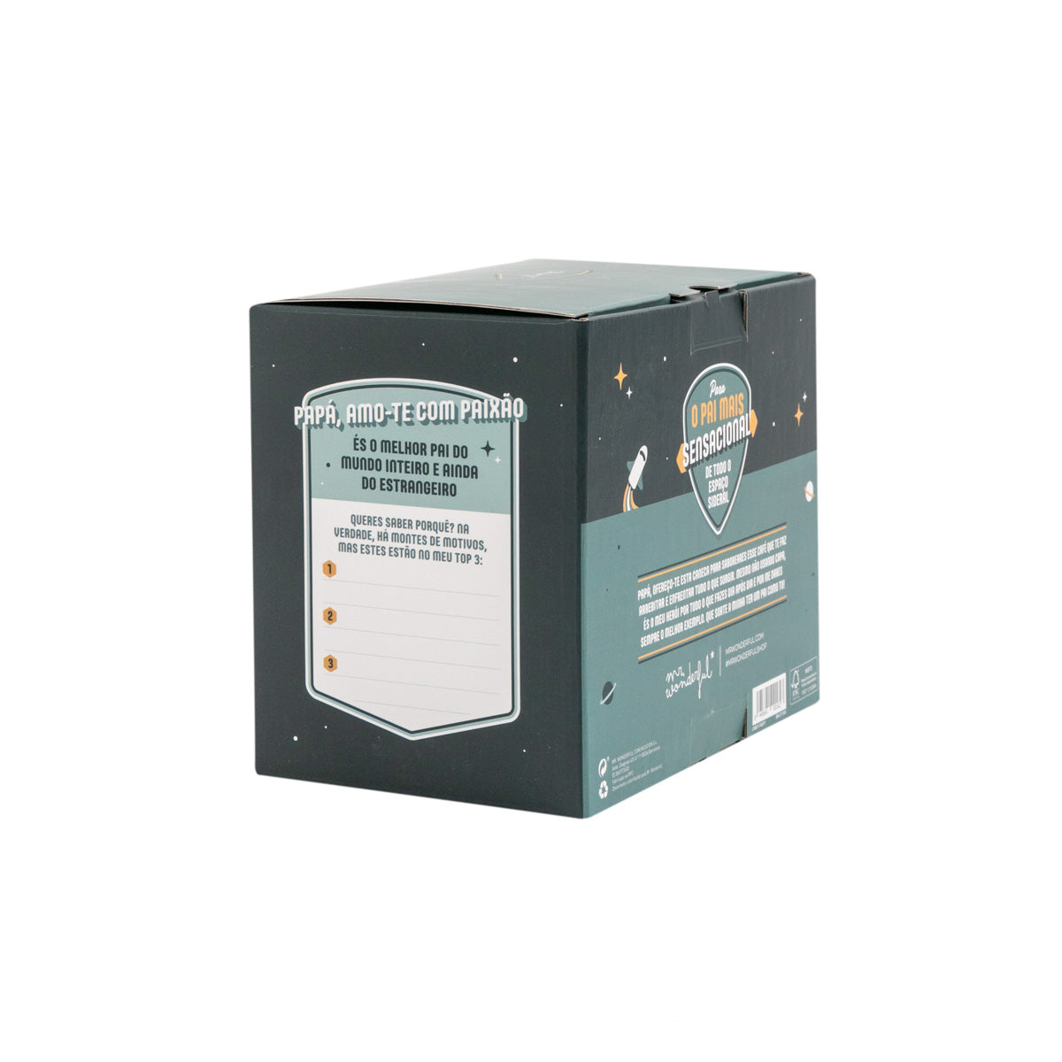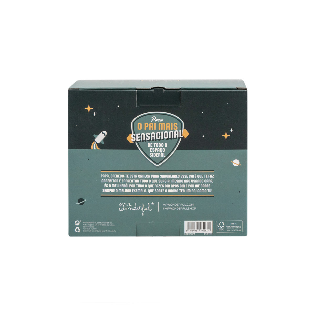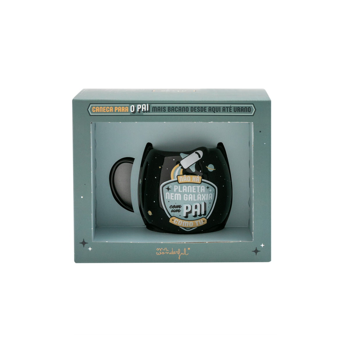 É indiferente as voltas que deres ao sistema solar, não interessa o que fizeres a bordo de um foguetão rapidíssimo ou a pilotar uma nave especial com um itinerário cheiinho de paragens solicitadas. Sabes que, onde quer que vás, não encontrarás um pai melhor nem mais carinhoso e mais fantástico do que o teu. Claro que sim! Por isso, quisemos dedicar-lhe uma caneca para pais que é quase, quase tão fantástico como ele. Trata-se de uma caneca Mr. Wonderful fabricada em cerâmica e que lhe vai permitir desfrutar do seu café, chá ou chocolatinho e tirar ainda mais partido desse bocadinho. Porque se trata de uma caneca com uma mensagem muito divertida e emotiva que diz: “Não há planeta nem galáxia com um pai como tu”. Boa, uma frase com que estamos mais que certos que vai conquistar o coração do teu pai, enchendo-o de emoção e carinho do bom e do melhor. Além disso, esta caneca tem uma capacidade de 330 ml e é apta tanto para aquecer no micro-ondas como para ser lavada na máquina da louça. E, para terminar, presta atenção à embalagem, porque esta caneca tão superfixe chega numa caixa em cuja parte traseira também há espaço para completares um texto personalizável dedicado ao teu pai. E assim se consegue um presente único e fantástico!