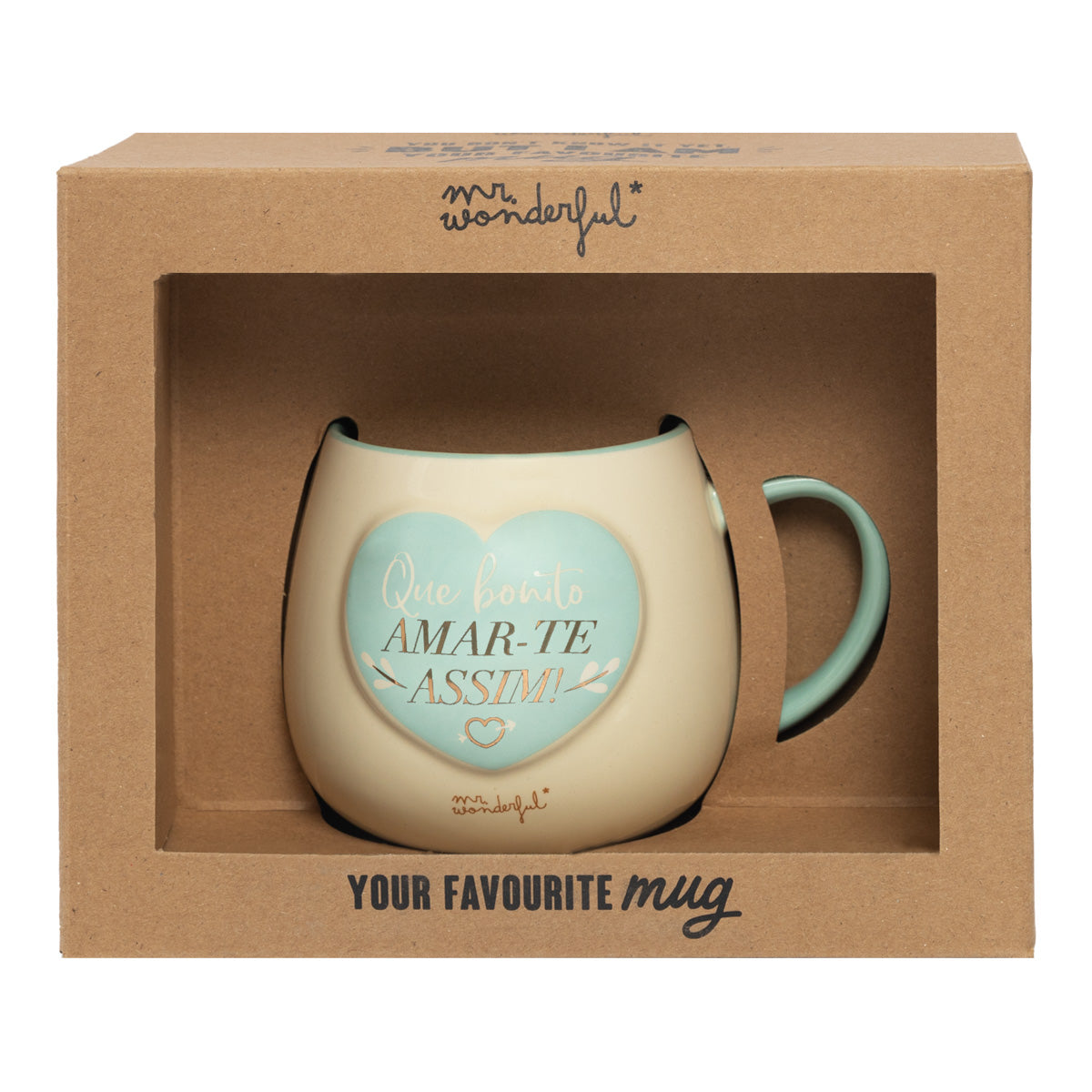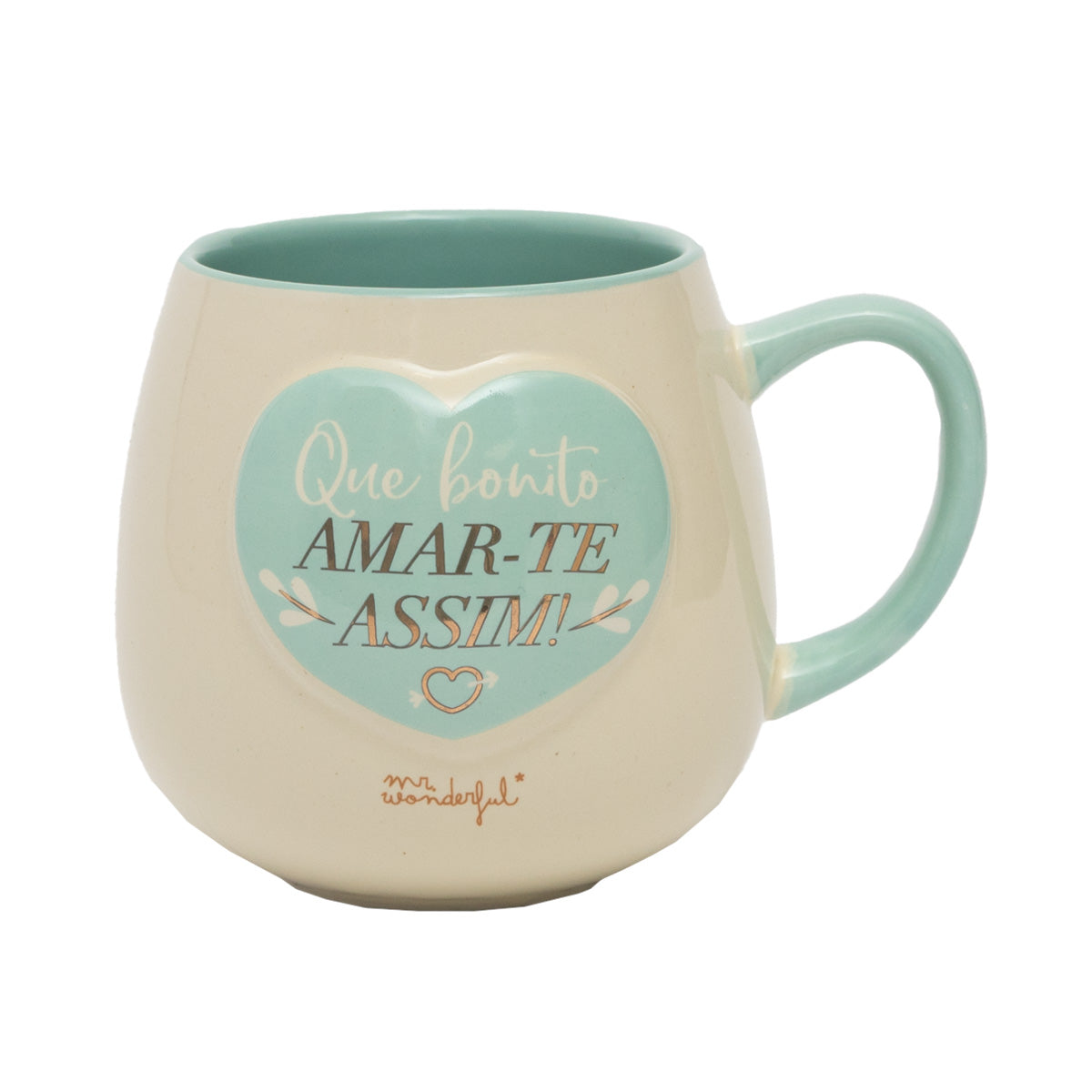 Caneca de cerâmica com relevo e mensagem de amor ou até de casamento. A asa e o interior são de cor diferente do exterior da caneca, o que lhe confere originalidade. Capa cidade: 320 ml.