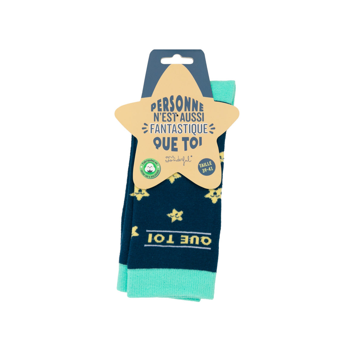 Chaussettes avec motif étoile et message motivant en français, réparti entre les deux chaussettes. Taille 35-38.