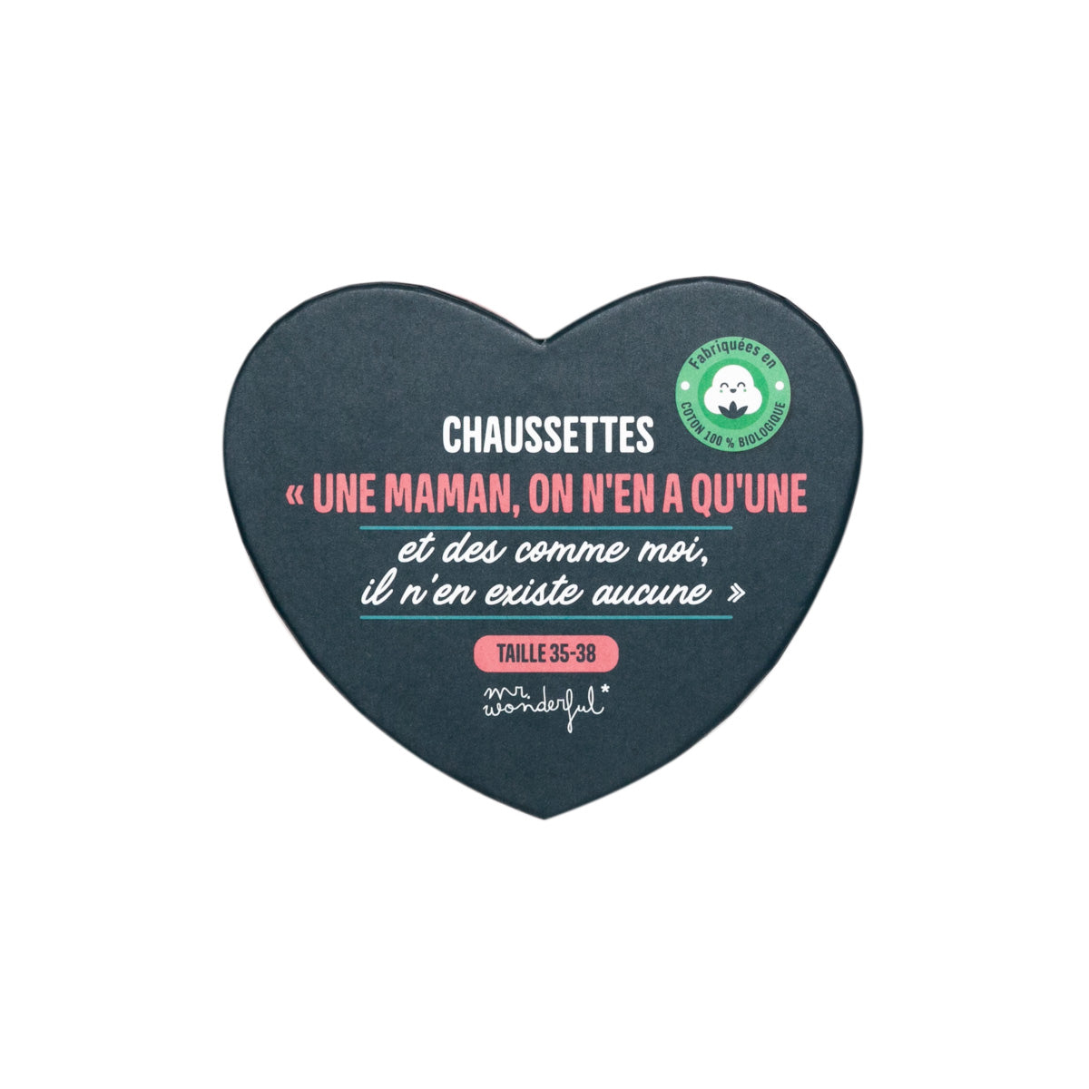 Il y a une phrase qui correspond parfaitement à ta maman, c’est celle qui est inscrite sur ces fantastiques chaussettes avec message. Tu adorerais qu’elle l’ait tout le temps à l’esprit et la meilleure façon selon nous, après le tatouage, c’est de la mettre sur ces chaussettes au design signé Mr. Wonderful. Et le résultat est génial ! Nous avons sélectionné les couleurs préférées de ta mère et des matériaux d’excellente qualité, comme le coton biologique. Elles resteront aussi belles qu’au premier jour. Il faut juste les laver sur l’envers à l’eau froide, sans les nettoyer à sec ni utiliser de javel, de fer à repasser ou de sèche-linge et le tour est joué. Ces chaussettes sont fin prêtes pour compléter le look de ta maman comme si c’était une vraie influenceuse. Le tiroir des chaussettes de ta mère va recevoir une paire de reines qui prendront tout de suite une place de choix. Tu les trouveras en deux tailles, tu n’auras qu’à choisir la plus adaptée pour ces pieds qui ont été si souvent à tes côtés. Maintenant, à chaque pas qu’elle fera avec ces chaussettes, elle se souviendra avec fierté de combien elle compte pour toi. Prépare-toi à recevoir un MERCI aussi grand que le sourire avec lequel il sera dit !