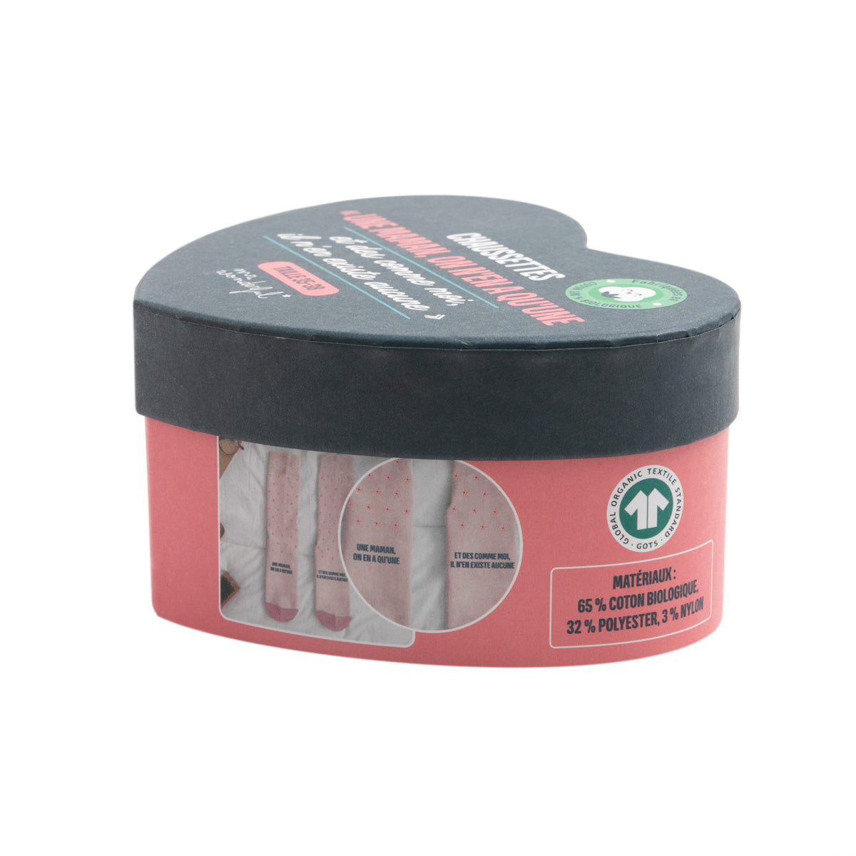 - Chaussettes avec message adressé aux mères, le message est partagé entre les deux chaussettes.