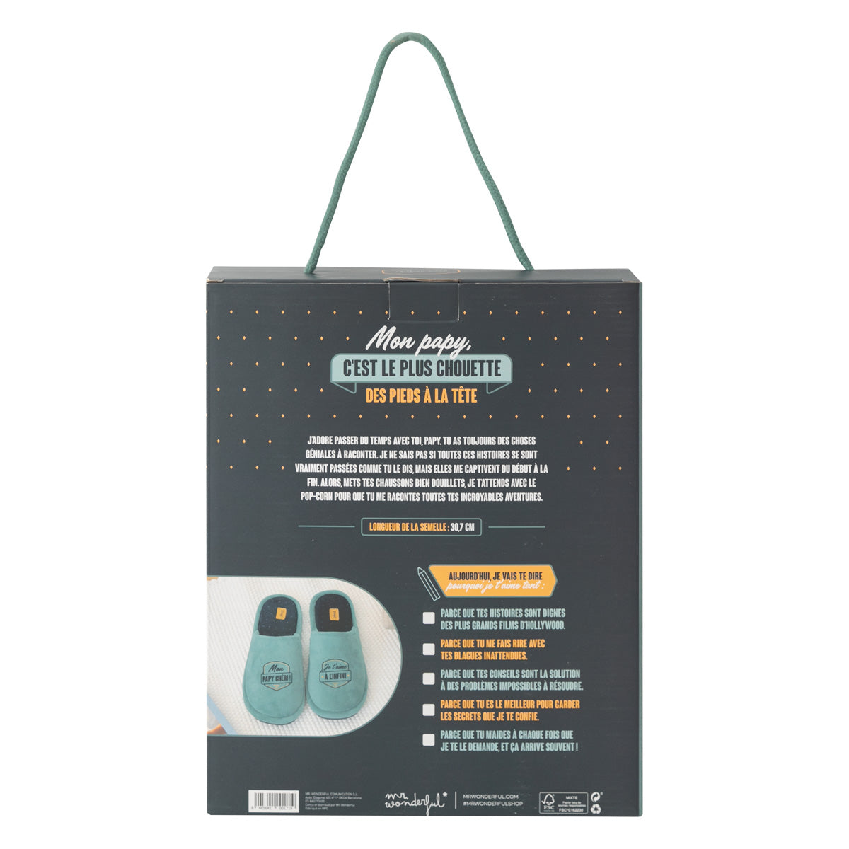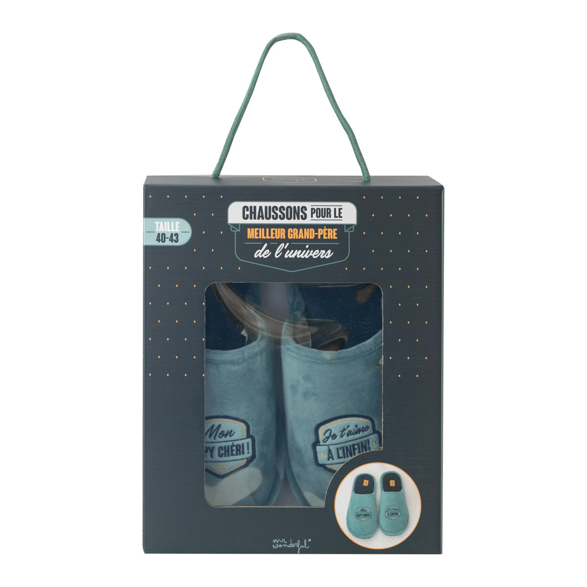 Les moments que nous passons avec nos grands-pères sont vraiment très précieux. Chaque minute passée avec eux, c’est comme ouvrir un incroyable livre et voir des pages qui n’en finissent pas de te surprendre. Chez Mr. Wonderful, nous adorons les grands-parents et nous savons qu’il y en a un trèèèèès spécial à tes yeux. Enfin, deux. Tu apprends toujours quelque chose de nouveau à ses côtés et tu as toujours envie d’écouter ce qu’il te raconte, avec cette façon de s’exprimer si particulière qui te fait tellement rire. Il y a des choses, il n’y a que lui pour y penser ! Qu’est-ce que tu dirais de le faire se sentir super bien grâce à ces chaussons tellement confortables avec un message ? Nous les avons créés avec beaucoup d’amour, parce que ton grand-père mérite ce qu’il y a de mieux. En plus d’être très doux et de bonne qualité, ils ont un message que tu lui as sûrement fait passer plus d’une fois. À partir de maintenant, à chaque fois qu’il regardera vers le bas, il pourra lire « Mon papy chéri ! Je t’aime à l’infini ». Tu imagines son air quand il se lèvera et qu’il enfilera ses chaussons pour grand-père ? Ce sourire durera sûrement toute la journée. Ah là là, quelle joie il se fera de recevoir un si beau cadeau !