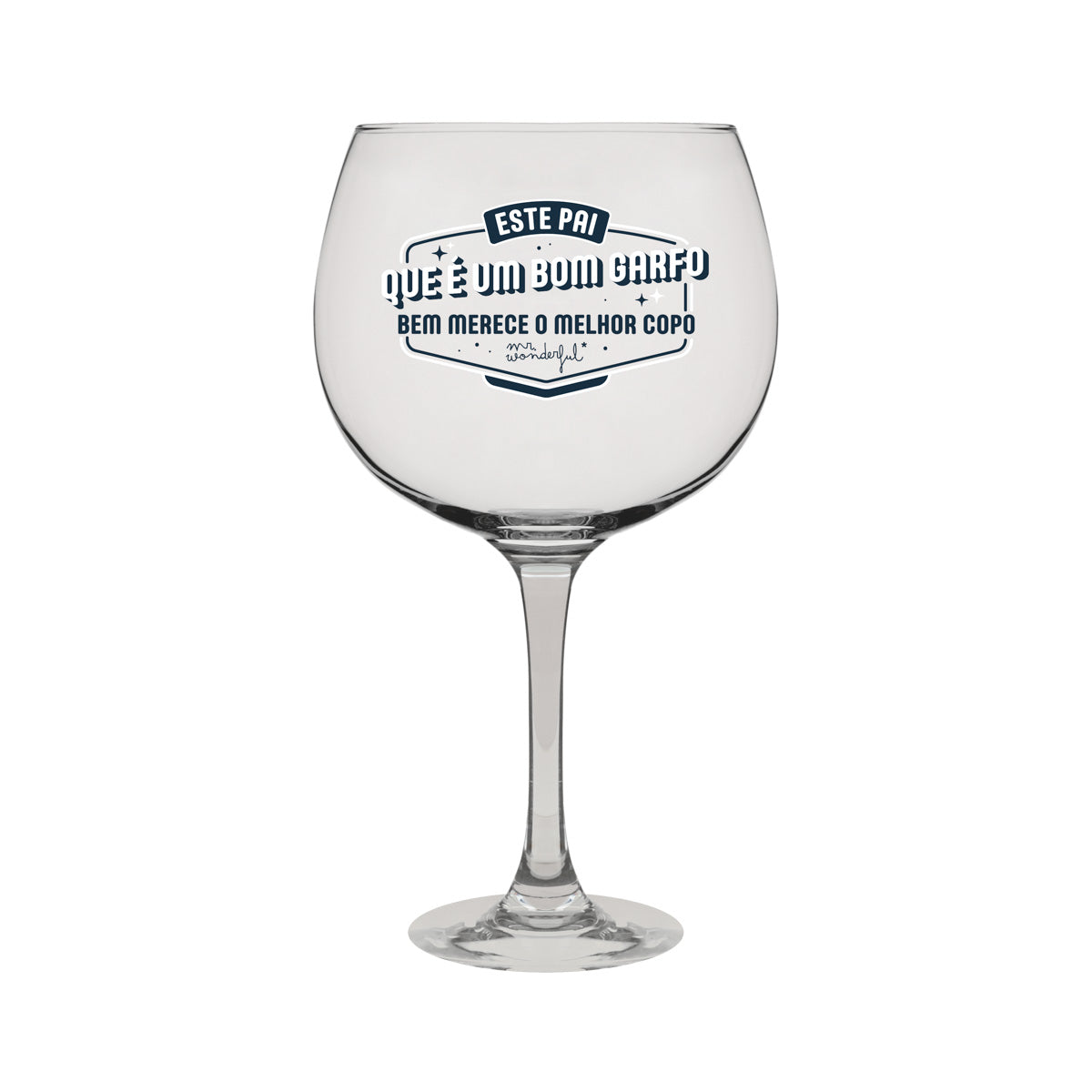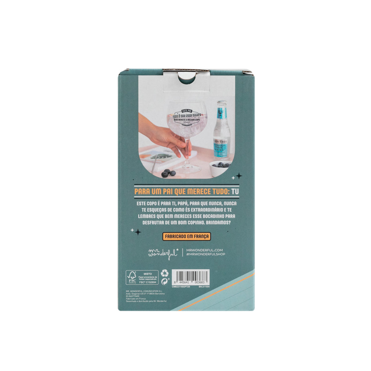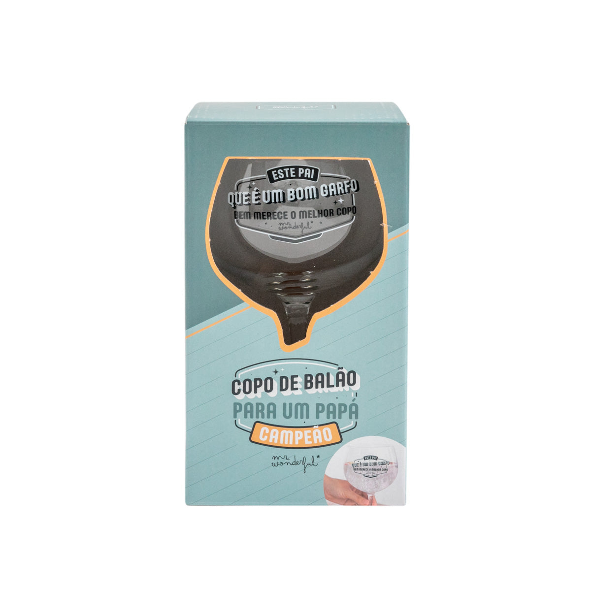 É que se trata de um copo Mr. Wonderful de vidro, fabricado em França e com uma capacidade de 70 0 ml, apto para bebidas em geral, combinados ou cocktails com ou sem álcool para brindar e desfru tar. Vai ser um não mais parar. Além disso, este copo de balão para o Dia do Pai está decorado com uma divertida mensagem que diz: “Este pai que é um bom garfo bem merece o melhor copo”. Recor da que é apto para ser lavado na máquina da louça e, sobretudo, para saborear momentos de relax e de brinde por tudo o que de bom está para vir. Yeaaah!