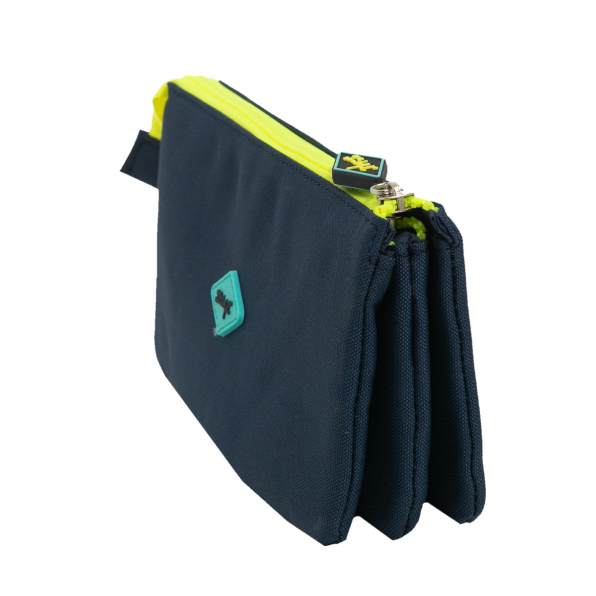 Estojo com três compartimentos individuais e fecho de correr. Fabricado em rPET, um material 100 % reciclável obtido a partir da reciclagem de garrafas de plástico.