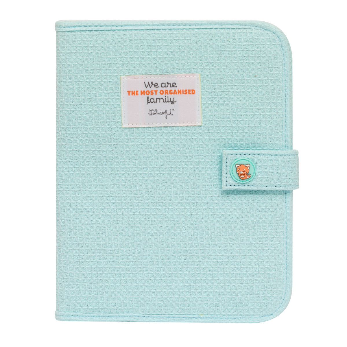 Portadocumentos familiar de algodón en color azul, con el panda rojo Mr. Wonderful y cierre de botón de clic. Su diseño es original y de tacto suave, además de tener un divertido mensaje en inglés en la parte delantera. Cuenta con varios bolsillos en su interior para mantener organizados todos los documentos familiares.