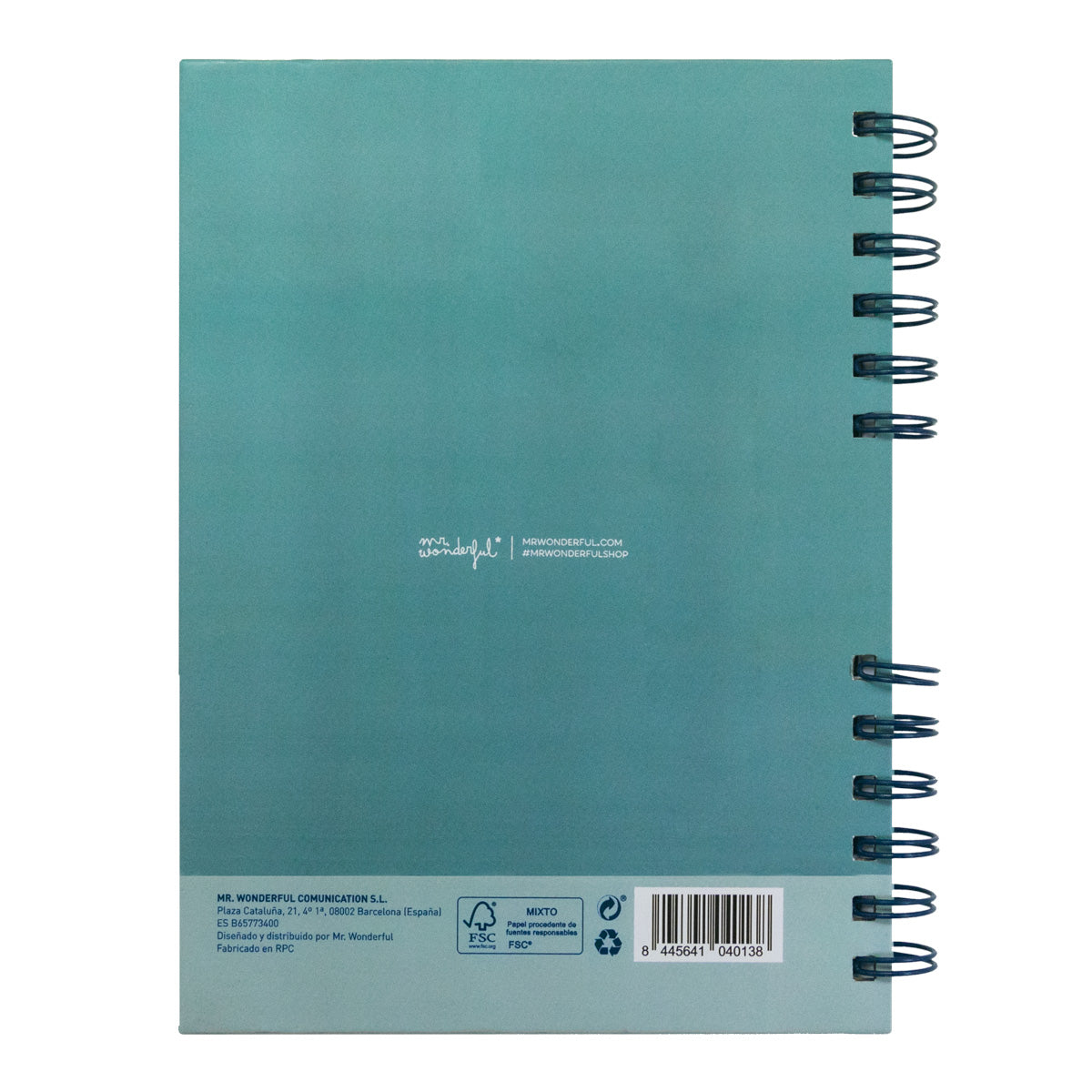 Libreta A5 con encuadernación en espiral partida, dividida en dos bloques, lo que le aporta originalidad y estilo. Con tapa dura y película antirrayaduras, en su portada se incluye un sistema de goma elástica con dos remaches metálicos, pensado para poder enganchar un bolígrafo (no incluido), haciéndola una libreta muy práctica e ideal para estudios o trabajo. Cuenta con 160 páginas pautadas. El producto tiene el sello de certificación FSC, lo que garantiza que ha sido fabricado con papel proveniente de bosques gestionados de manera responsable. Incluye 1 hoja de pegatinas.