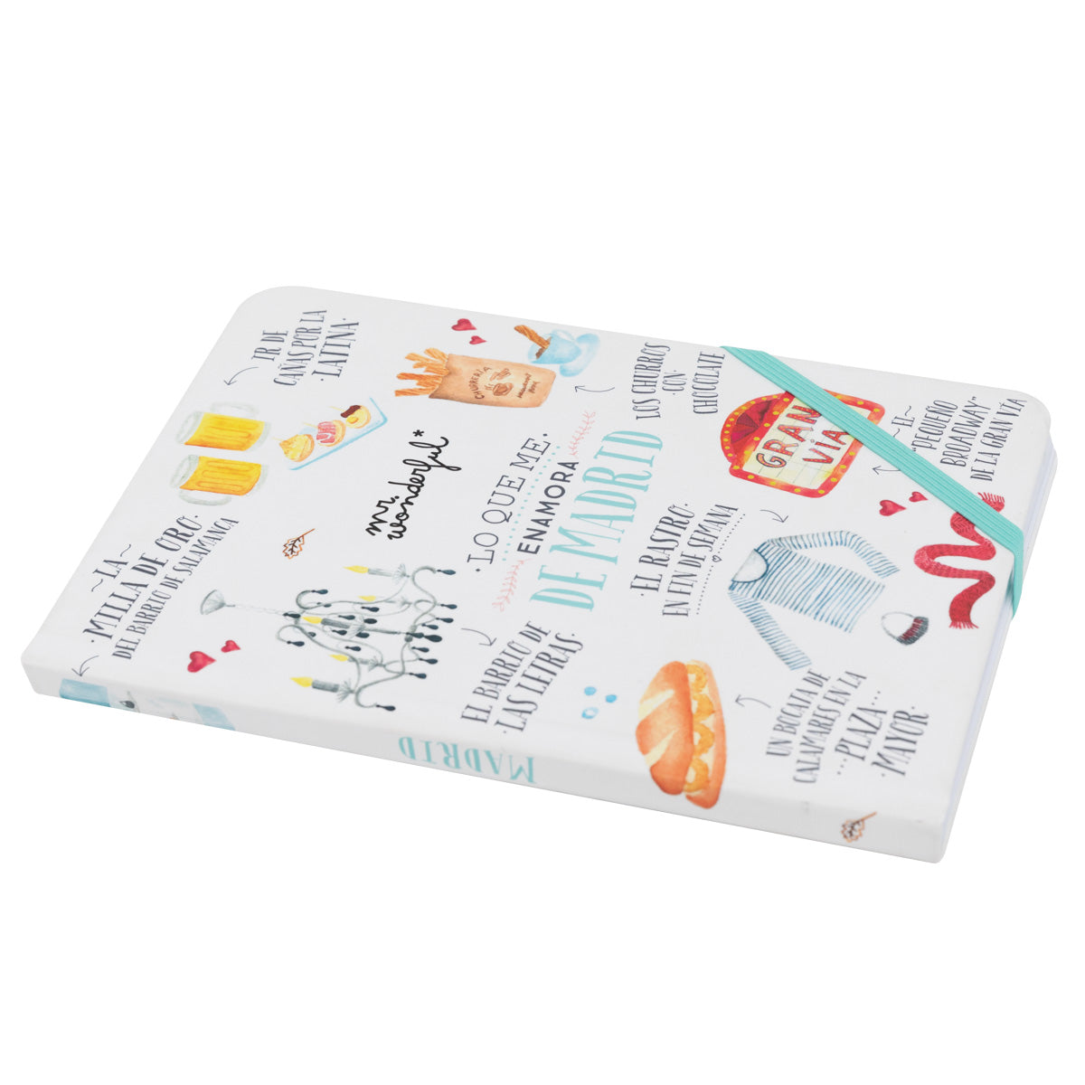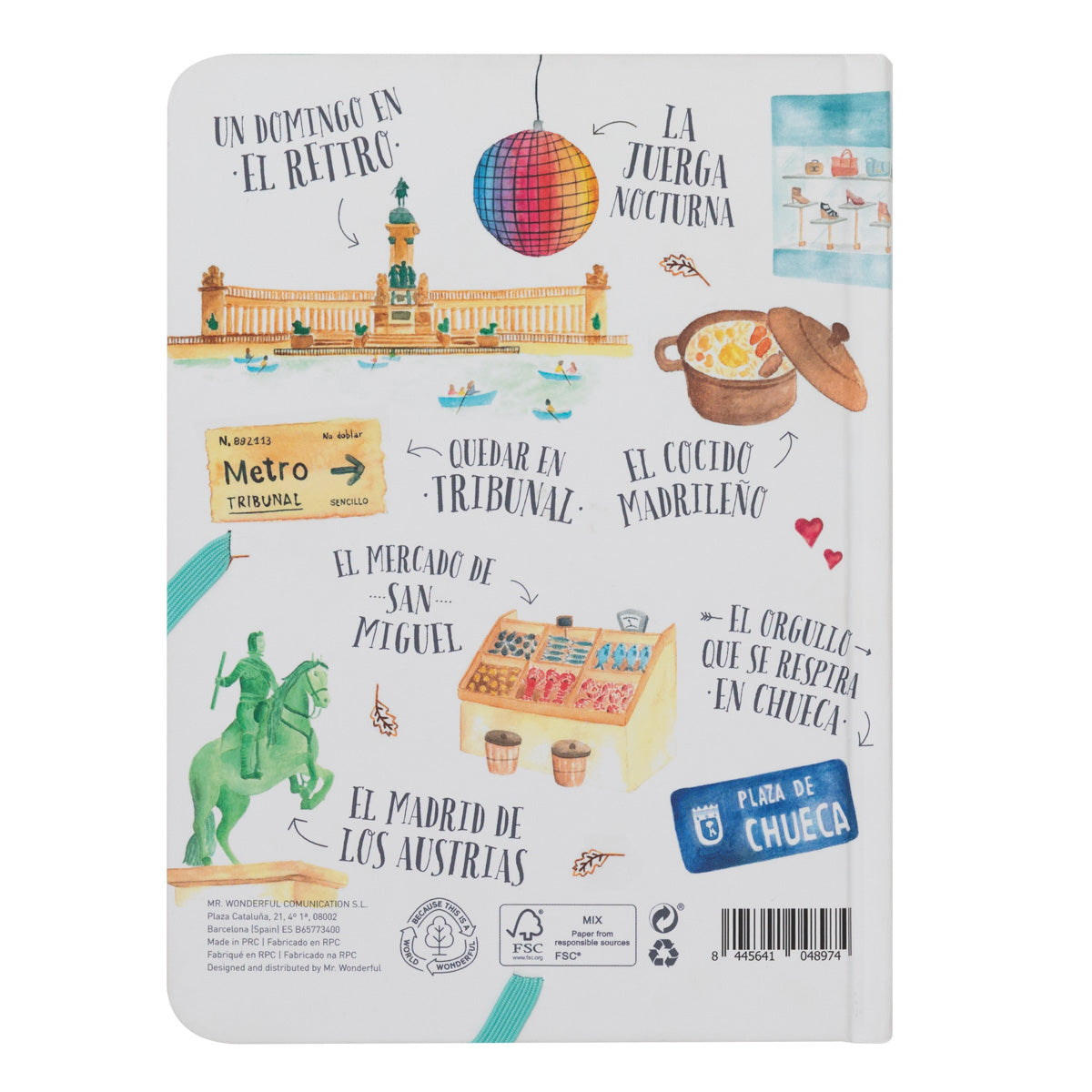 Libretto A5 con copertina rigida e finitura soft touch. Il design mostra alcune delle principali attrazioni turistiche della città di Madrid. Include un elastico per la chiusura in uno degli angoli. Rilegatura cucita che permette un'apertura a 180°, rendendolo molto pratico da usare. Contiene 160 pagine di carta rigata da 80 gr con certificazione FSC, che garantisce che la carta proviene da foreste gestite in modo responsabile.