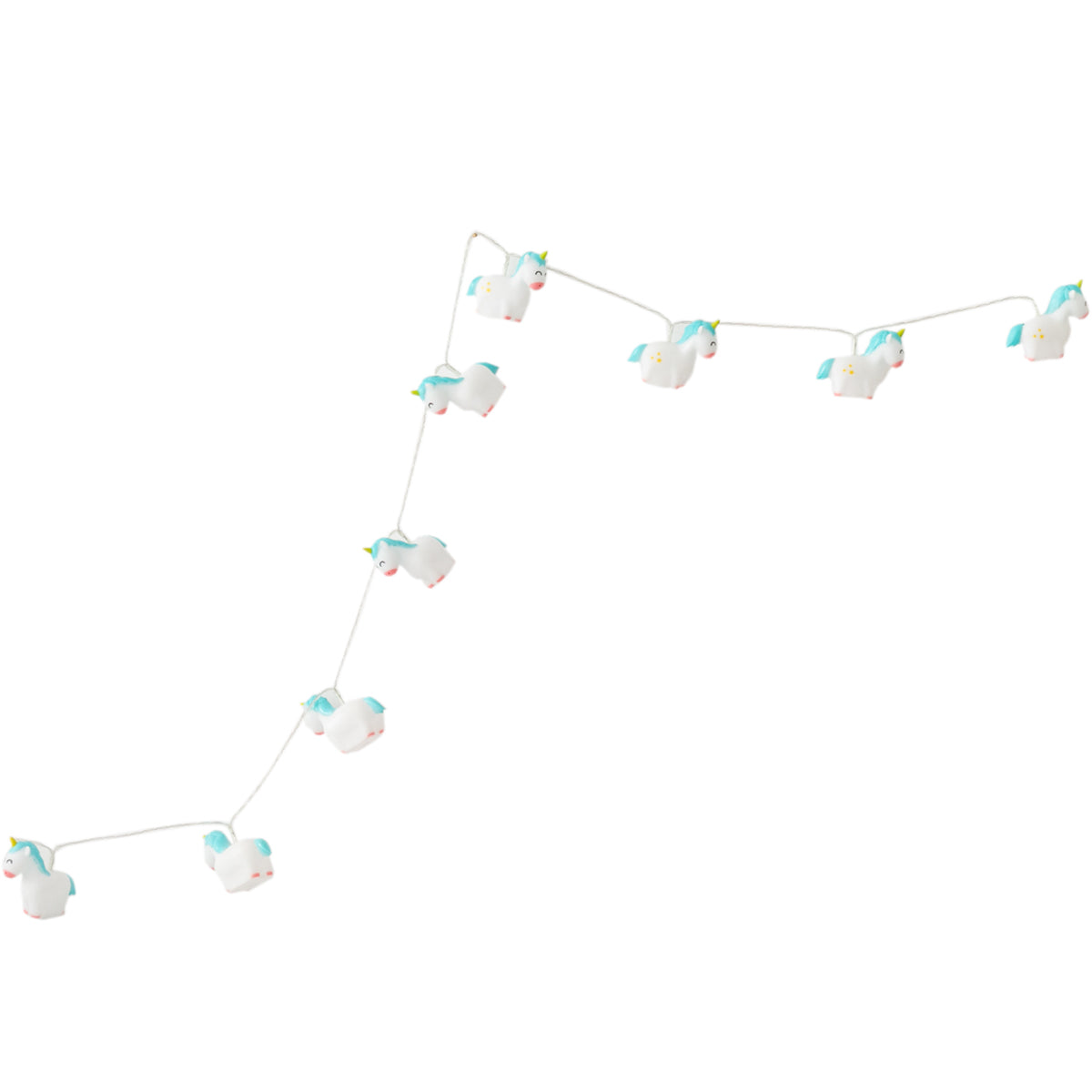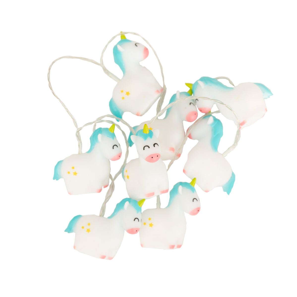 Guirnalda de luces para decoración de habitaciones infantiles. Consta de 10 luces, cada una de ellas con forma de nuestro fantástico unicornio.