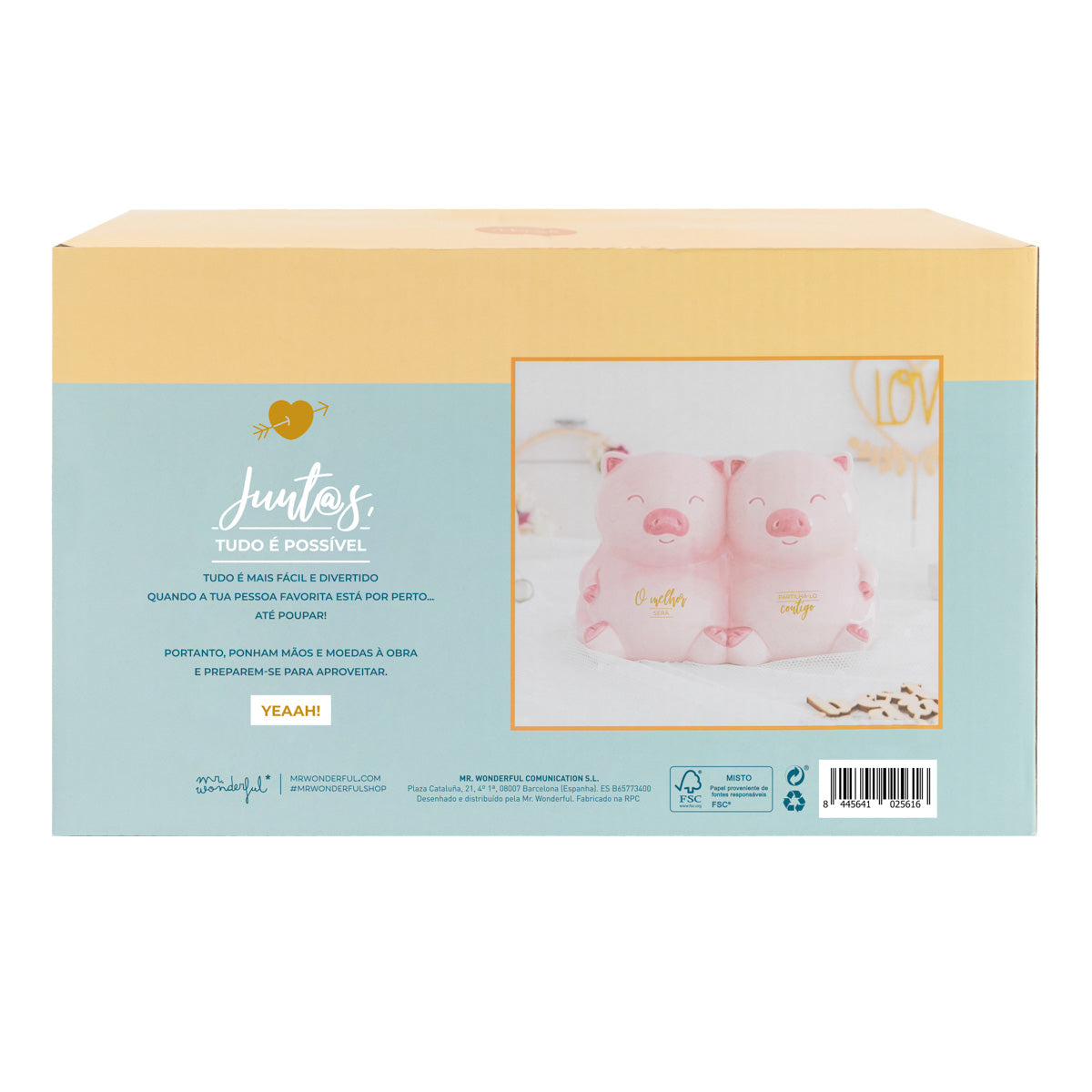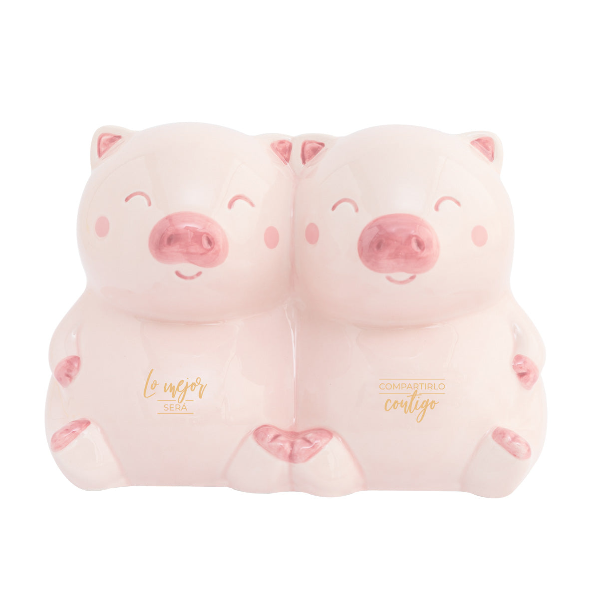 Mealheiro fabricado em cerâmica, em vez de ter a forma do típico porquinho dos mealheiros, neste caso trata-se de um casal de dois porquinhos, o que confere originalidade ao produto. Possui uma tampa na sua parte inferior para se poder ter acesso ao dinheiro poupado.
