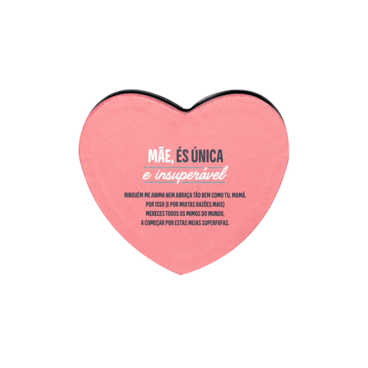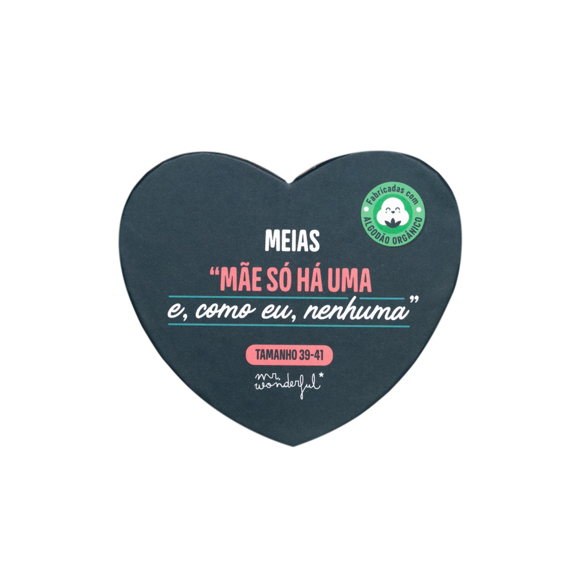 Há uma frase que define muito bem a tua mãe, que é precisamente aquela que estas fantásticas meias com mensagem têm impressa. Tu adoravas que ela a tivesse bem presente o tempo todo, e a melhor forma que se nos ocorreu, depois da tatuagem, é pô-la nestas meias com desenho da Mr. Wonderful que, aliás, nos saíram um luxo! Selecionámos as cores favoritas da tua mãe e uns materiais de excelente qualidade, como o algodão orgânico, para que, com cuidados muito simples, se mantenham sempre tão bonitas como no primeiro dia. Basta lavá-las do avesso em água fria, sem utilizar lavagem a seco, lixívia, ferro de passar ou máquina de secar e estarão prontas para completar o look da mamã como se fosse uma autêntica influencer. A gaveta das meias da tua mãe vai receber um par de rainhas que rapidamente vão assumir o comando. Podes encontrá-las em dois tamanhos e só tens de escolher o adequado para esses pés que sempre estiveram tão perto dos teus. Agora, a cada passo que der com estas meias, vai recordar com muito orgulho o quão importante ela é para ti. Prepara-te para receber um OBRIGADA tão grande como o sorriso que o vai pronunciar!