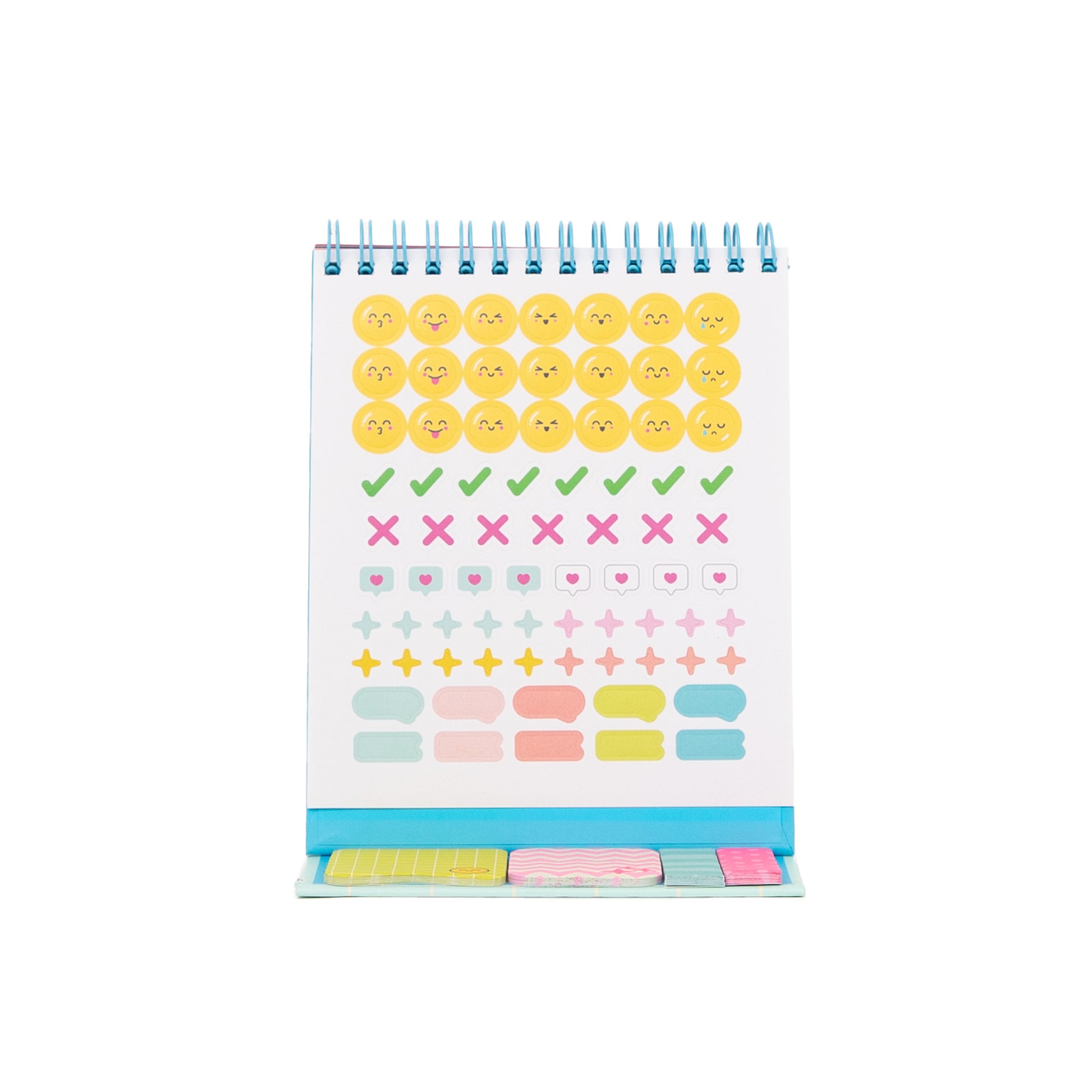 Piccolo calendario da tavolo. Include 1 foglio di adesivi, 2 blocchetti di note adesive e 2 blocchetti di segnalibri adesivi.