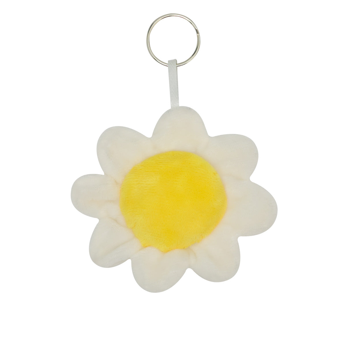 Llavero con enganche metálico y con una margarita de peluche Wonder en su extremo. Ideal para usar como decoración en la mochila.
