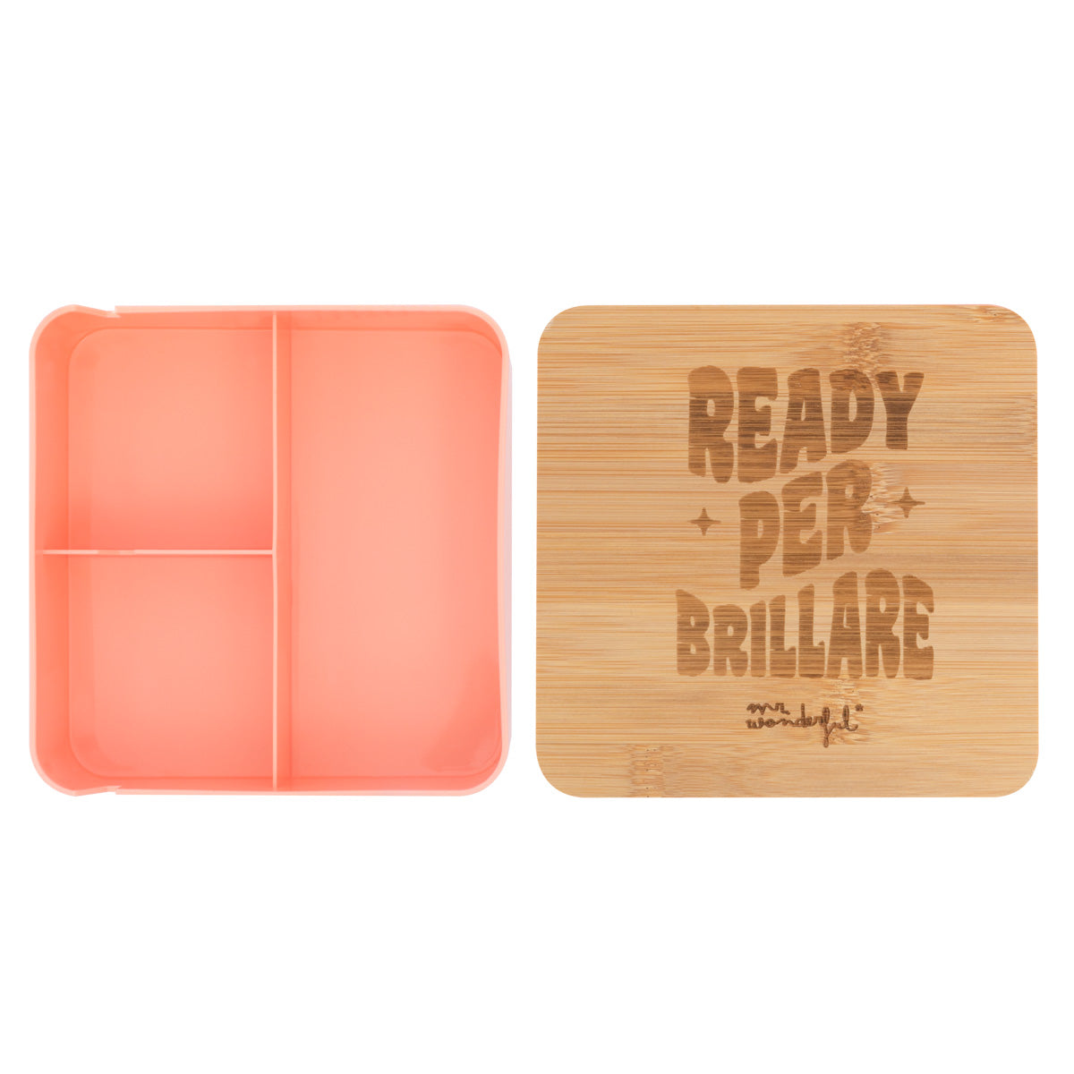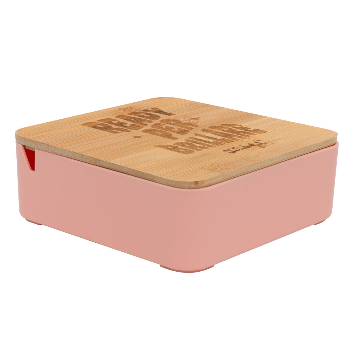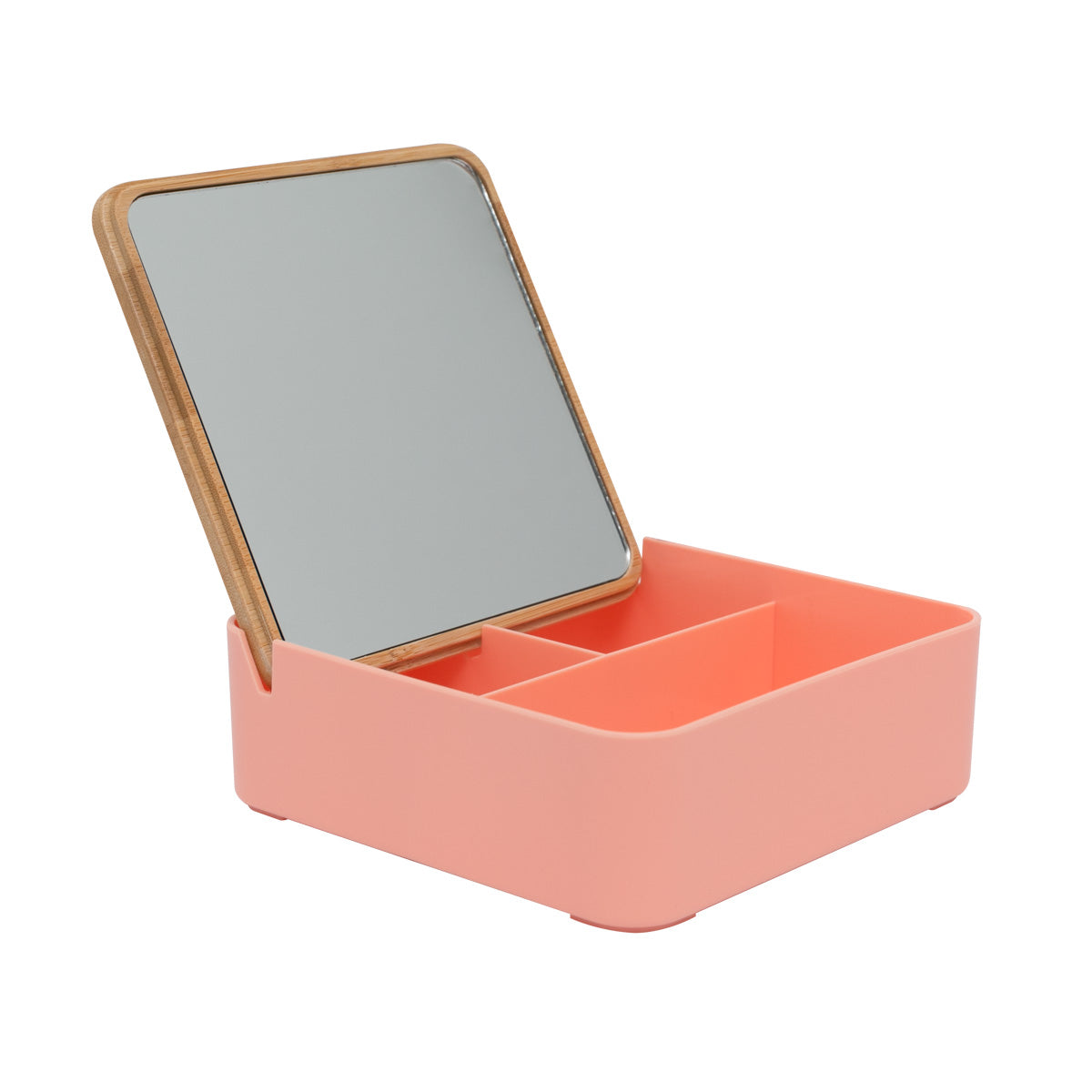 Portagioie realizzato in plastica, morbido al tatto e coperchio in bambù con messaggio inciso su di esso. Il coperchio ha uno specchio interno e, all'interno della base, si trovano diversi scomparti per conservare ordinati i gioielli.