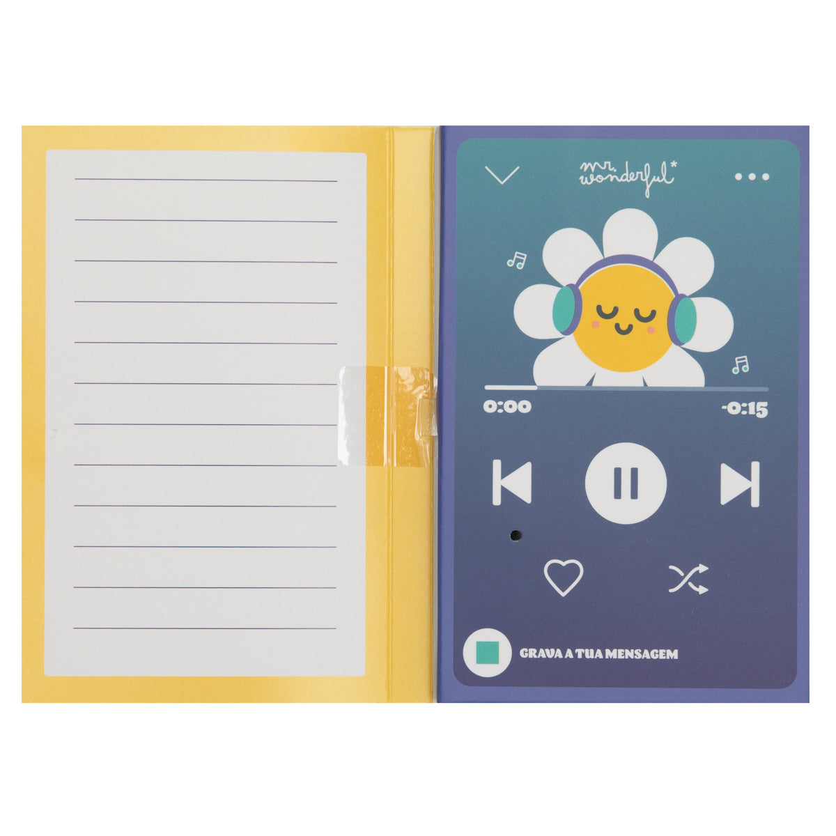 Postal com dispositivo para gravar e reproduzir áudio, ideal para oferecer a qualquer pessoa, pois a mensagem é suficientemente ampla.